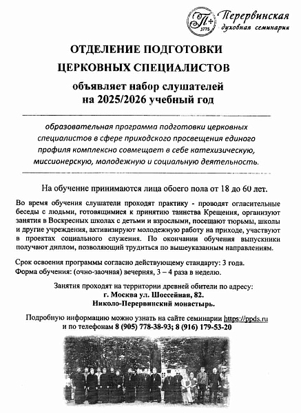 Перервинская духовная семинария объявляет набор слушателей на 2025/2026 учебный год