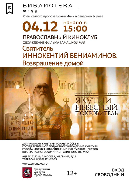 Православный киноклуб приглашает на кинопоказ "Святитель Инокентий Вениаминов. Возвращение домой"