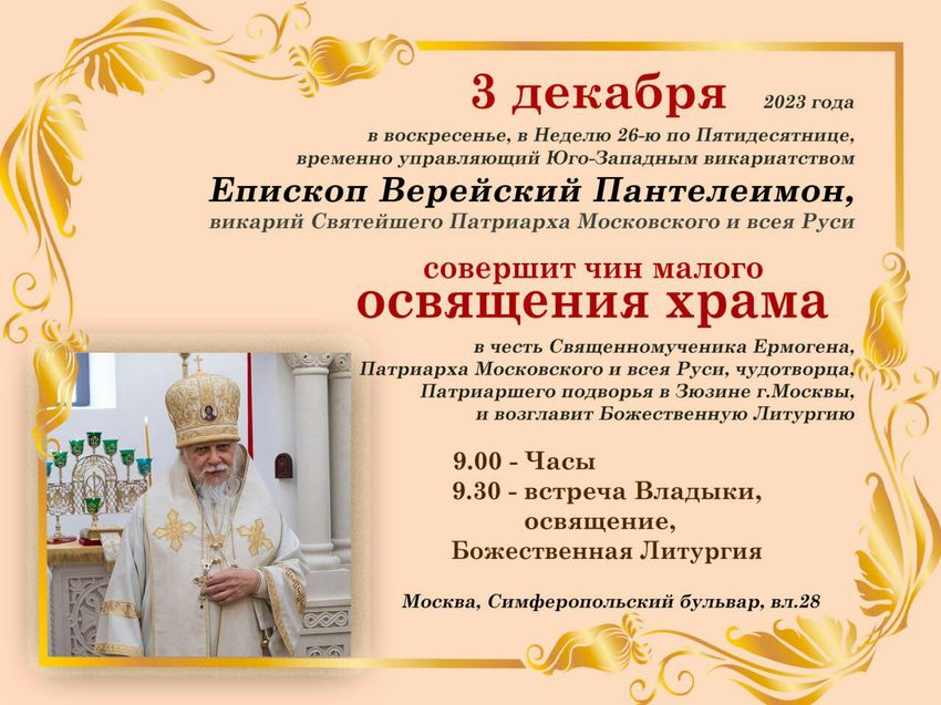 3 декабря 2023 г. Епископ Верейский Пантелеимон викарий Святейшего Патриарха Московского и всея Руси совершит чин освящения малого храма в честь священномученика Ермогена патриарха Московского и всея Руси, чудотворца, Патриаршего подворья в Зюзине.