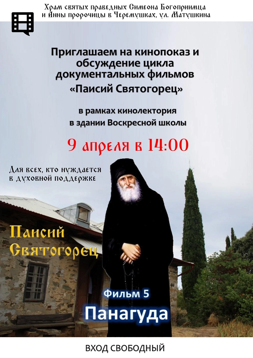 09 апреля в 14:00 приглашаем на кинопоказ и обсуждение документального фильма "Паисий Святогорец. Фильм 5. Панагуда".