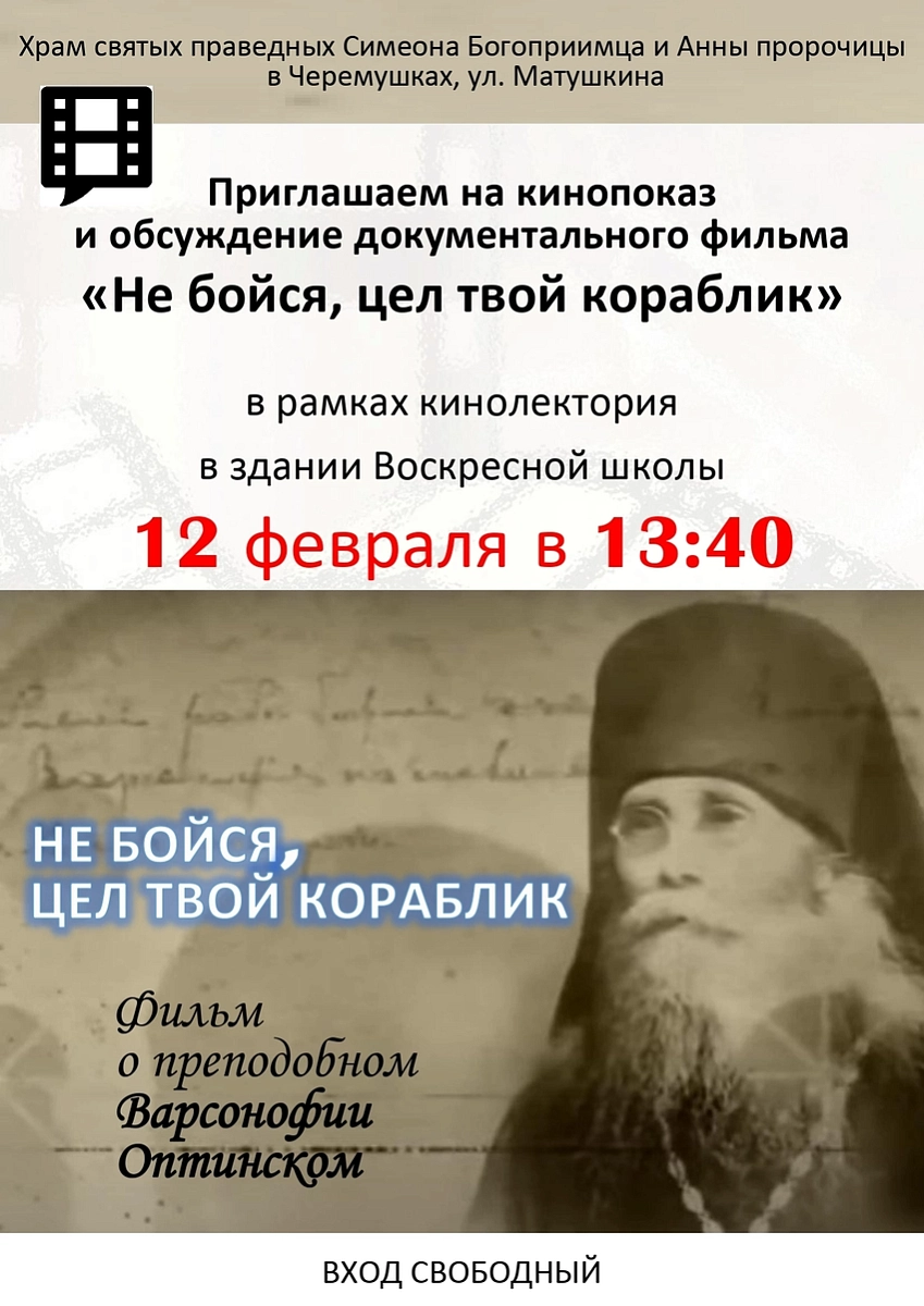 12 февраля в 13:40 приглашаем всех желающих на кинопоказ и обсуждение документального фильма "Не бойся, цел твой кораблик", который состоится в храме праведных Симеона Богоприимца и Анны пророчицы в Черемушках (ул. Матушкина).