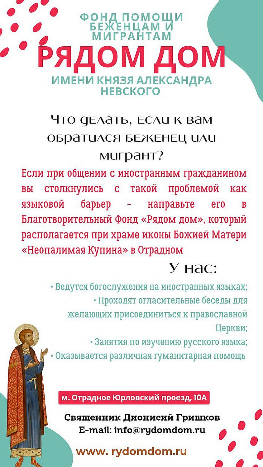 Что делать если к вам обратился беженец или мигрант? Направьте его в благотворительный фонд "Рядом дом"при храме иконы Божьей Матери "Неопалимая Купина" в Отрадном.