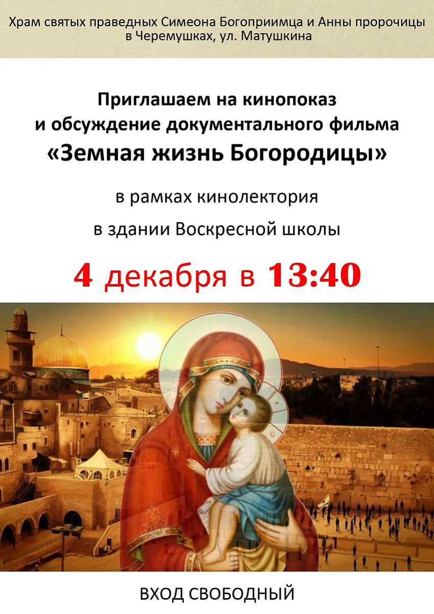 4 декабря, в 13:40 приглашаем Вас на Кинопоказ и обсуждение документального фильма "Земная жизнь Богородицы", который пройдет в храме святых праведных Симеона Богоприимца и Анны Пророчицы в Черемушках (ул. Матушкина) в здании Воскресной школы.
