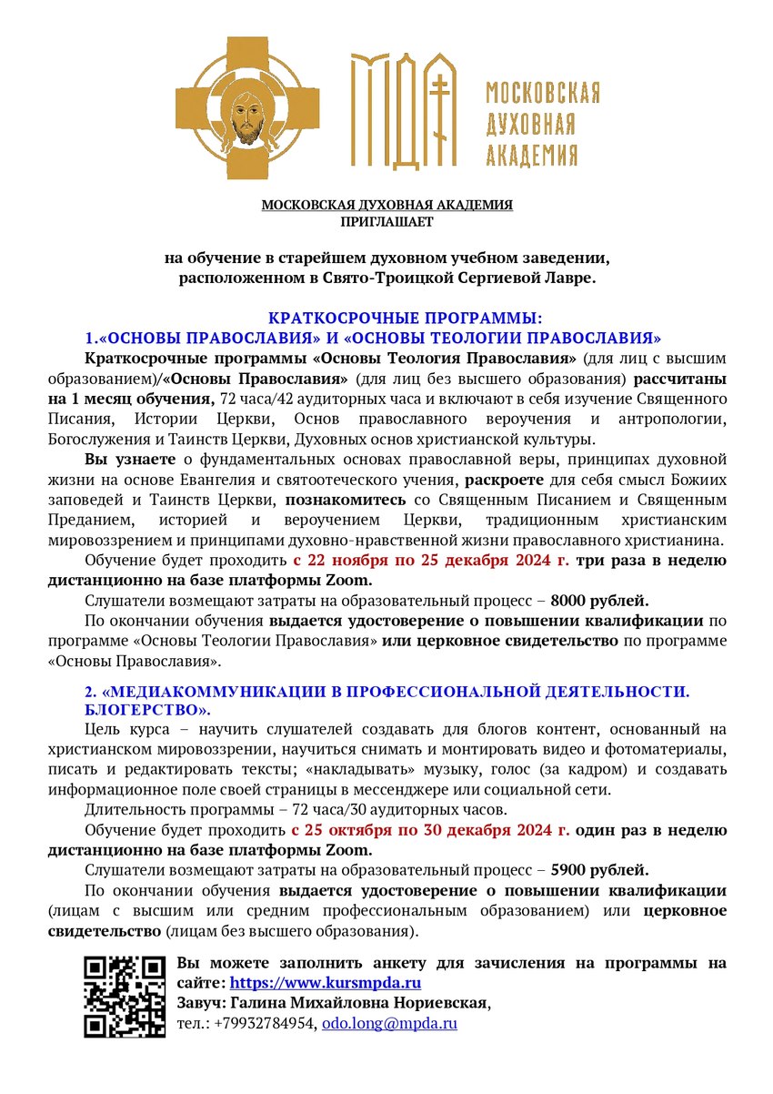 Краткосрочные программы «Основы Теология Православия» (для лиц с высшим образованием)/«Основы Православия» (для лиц без высшего образования) рассчитаны на 1 месяц обучения, 72 часа/42 аудиторных часа и включают в себя