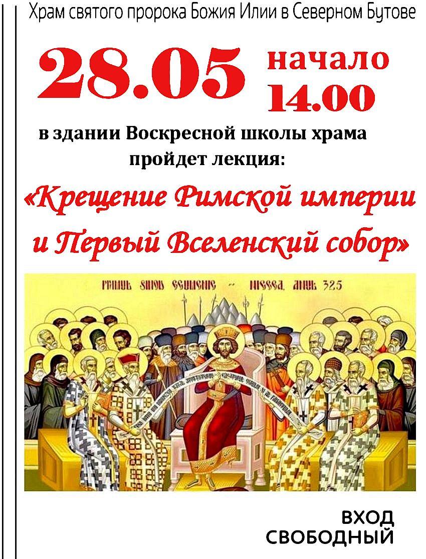 28 мая приглашаем всех желающих на лекцию "Крещение Римской империи и Первый Вселенский собор", которая состоится в храме святого пророка Божия Илии в Северном Бутове, в здании Воскресной школы храма.