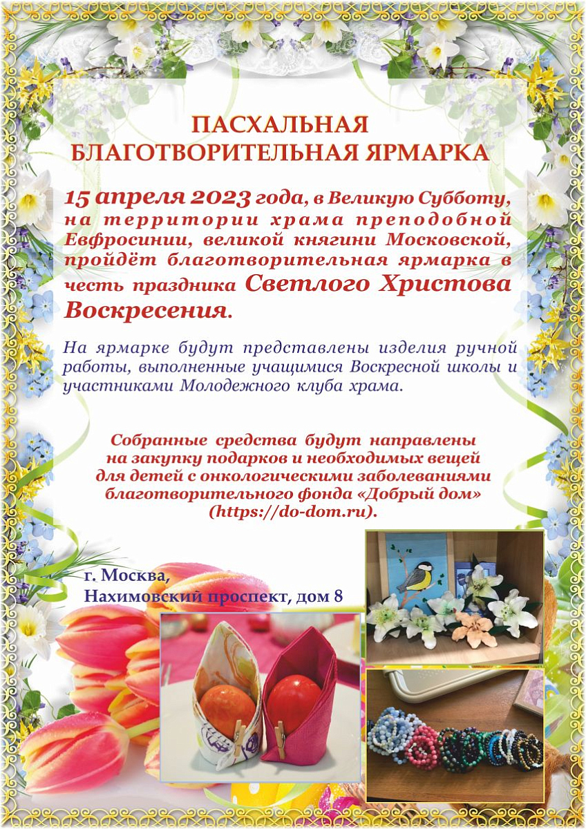 15 апреля 2023 года на территории храма преподобной Ефросинии, великой княгини Московской пройдет благотворительная ярмарка в честь праздника Светлого Христова Воскресения.