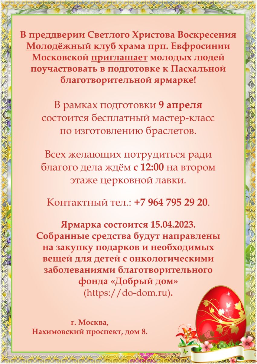 Приглашаем молодых людей поучаствовать в подготовке к Пасхальной благотворительной ярмарке.