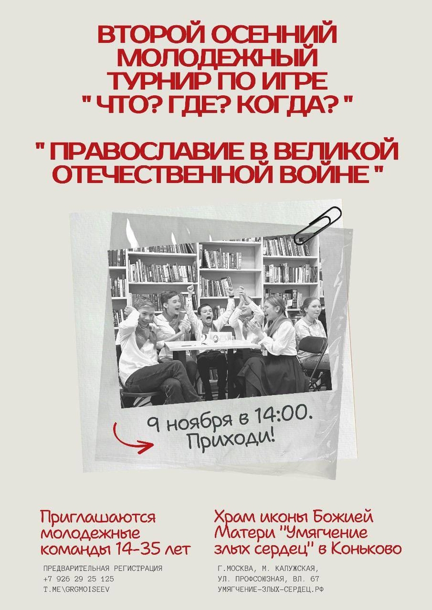 Храм иконы Божией Матери "Умягчение злых сердец" в Коньково приглашает принять участие в II молодежной патриотической исторической интеллектуальной игре в формате "Что? Где? Когда?", посвященной 80-летию Победы в Великой отечественной войне.