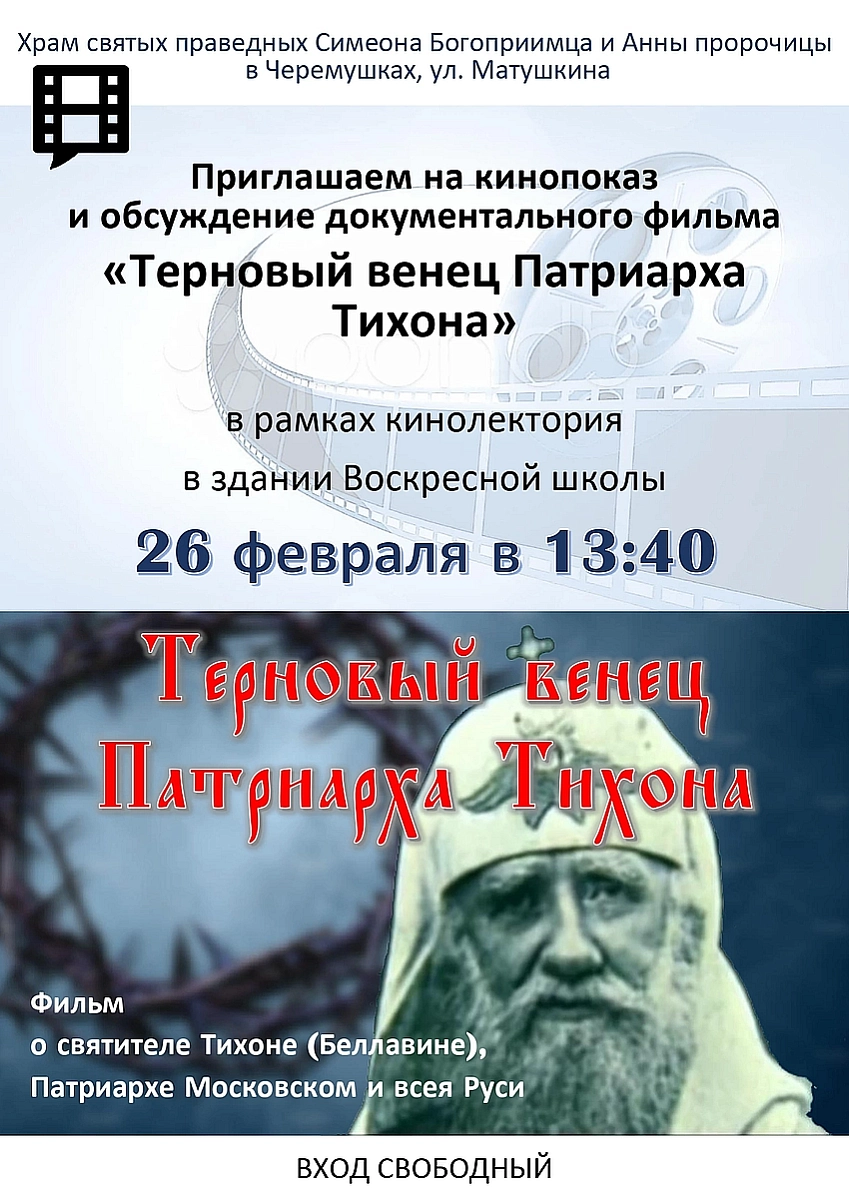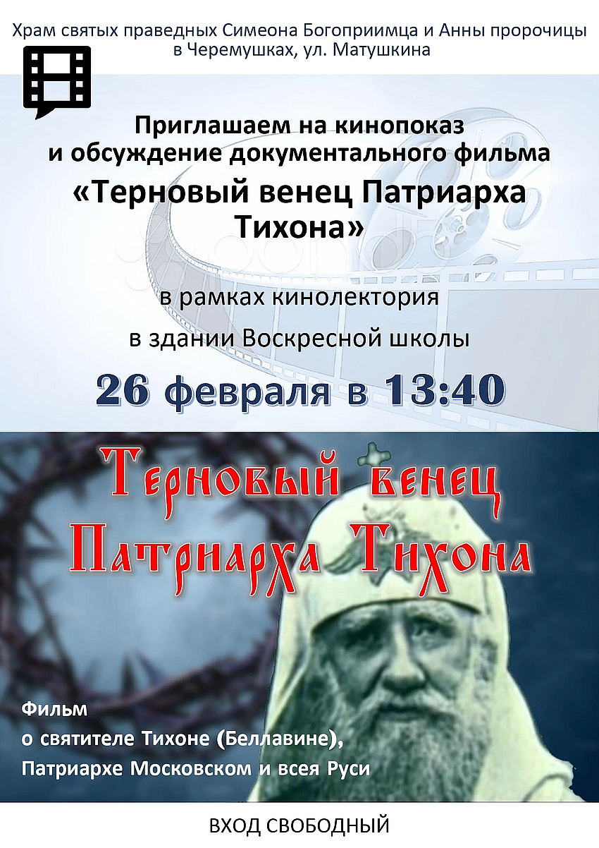 26 февраля в 13:40 приглашаем всех желающих на кинопоказ и обсуждение документального фильма "Терновый венец Патриарха Тихона".