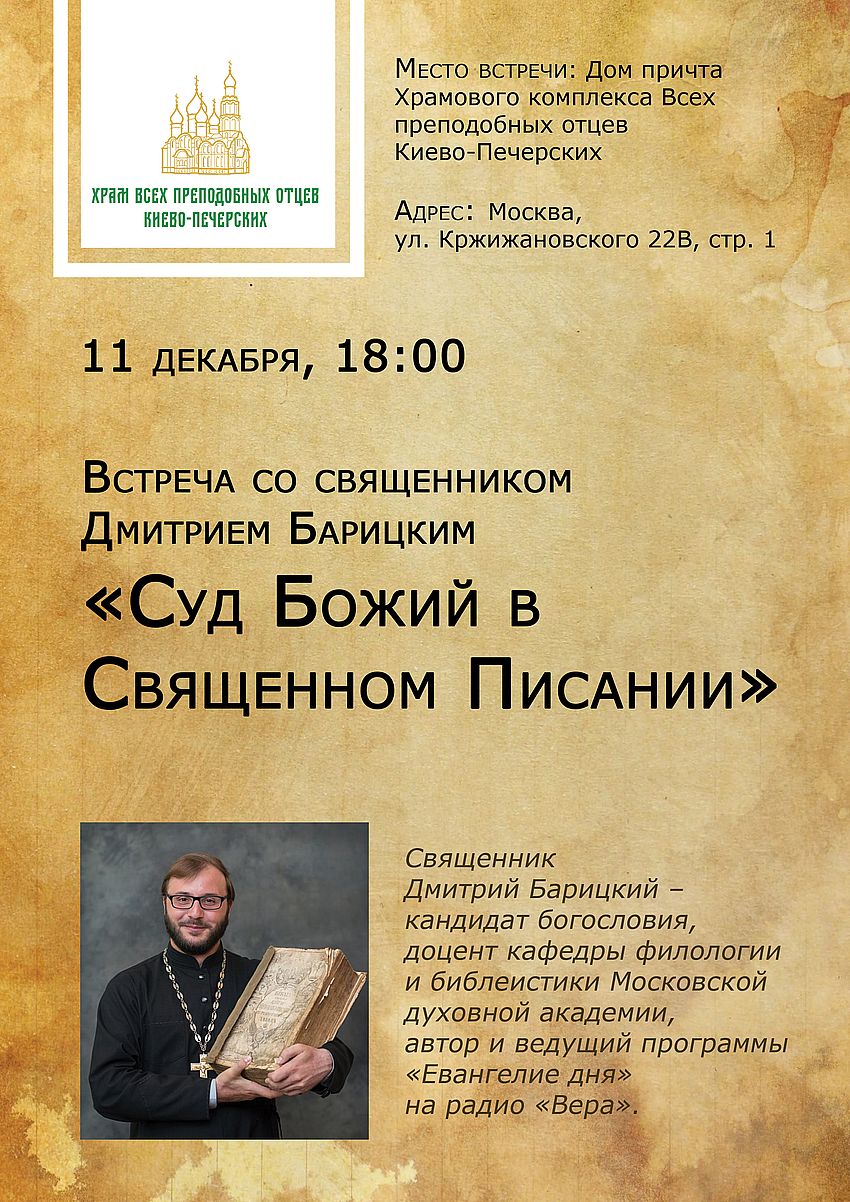 11 декабря, в 18:00, в доме причта Храмового комплекса Всех преподобных отцев Киево-Печерских состоится встреча со священником Дмитрием Барицким.