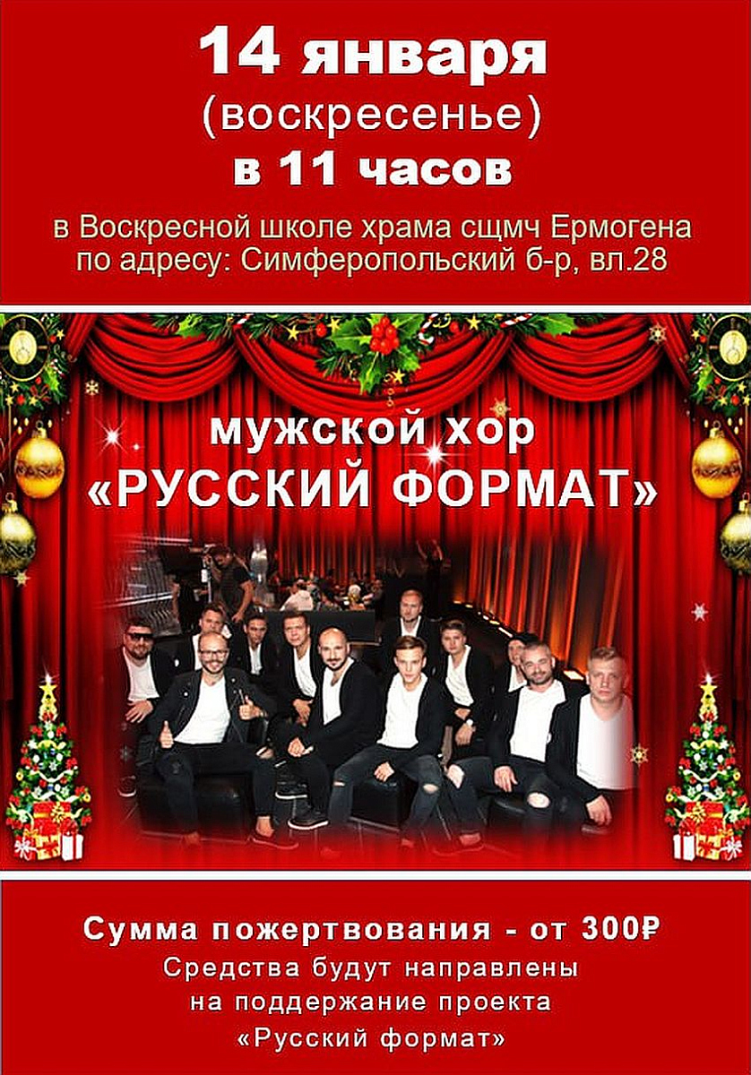 14 января в 11 часов приглашаем всех на концерт мужского хора "Русский формат" в храм священномученика Ермогена.
