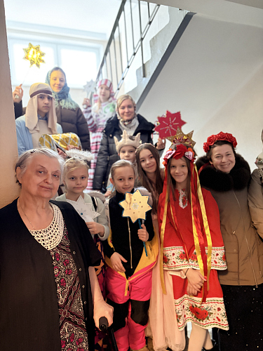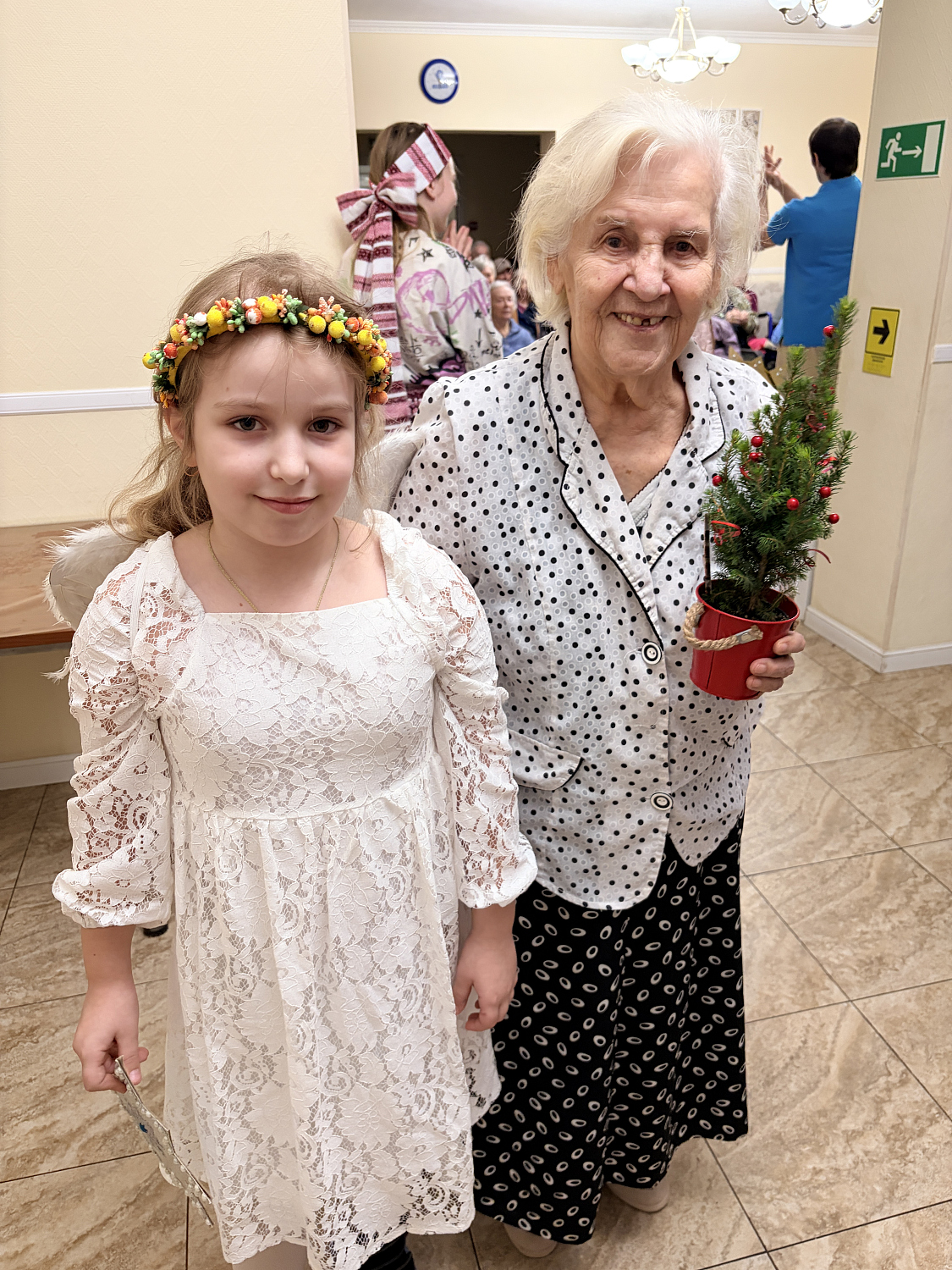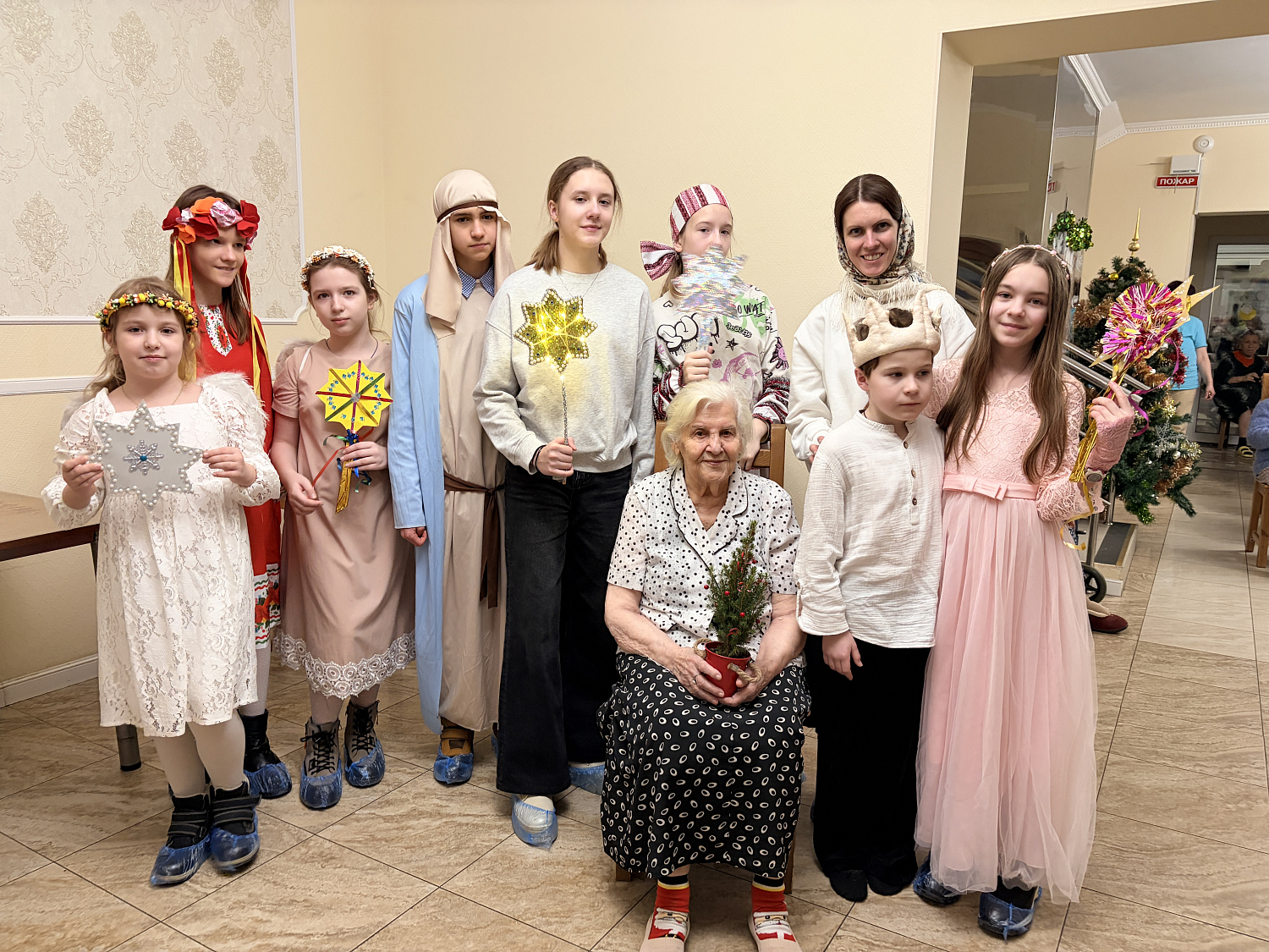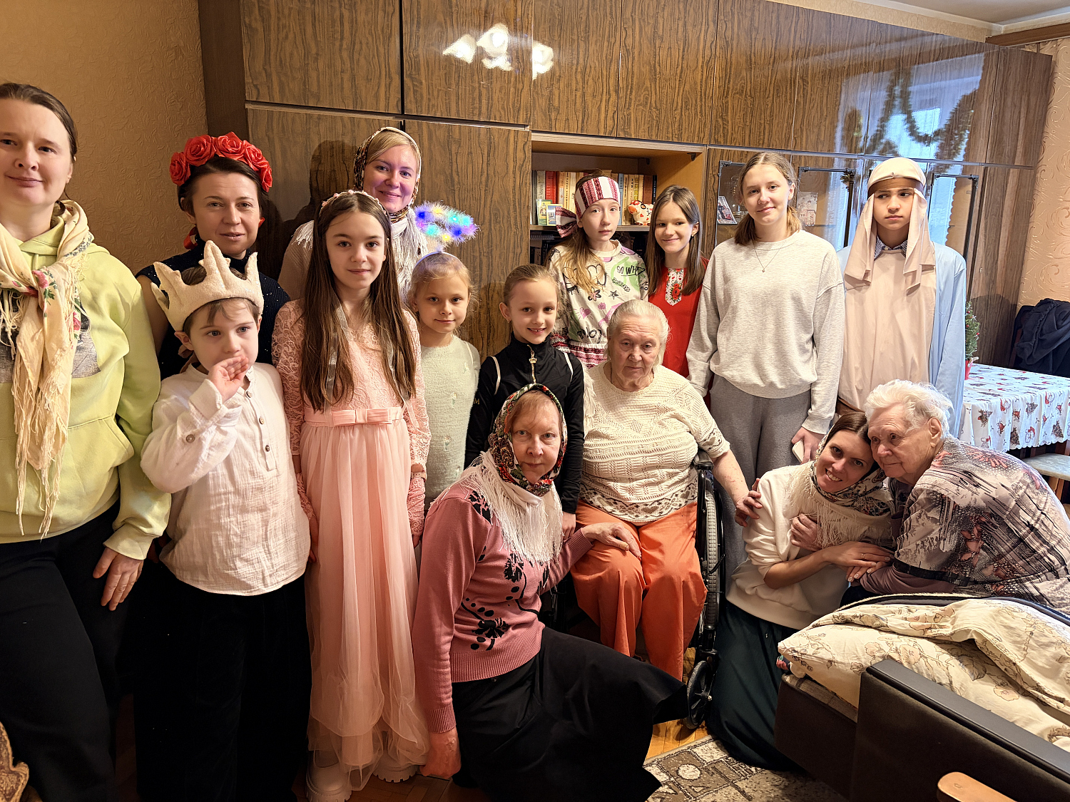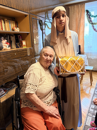 Особое внимание было уделено старейшей прихожанке храма Галине Ивановне, ныне проживающей в подмосковном пансионате для пожилых людей и лишенной возможности присутствия в храме. Вечером волонтеры специально приехали к ней в гости, наполняя ее праздник теплом молитвы и радости. Для нее и остальных постояльцев пансионата ребята подготовили особую программу, в которой прозвучали любимые Рождественские колядки и стихотворения.