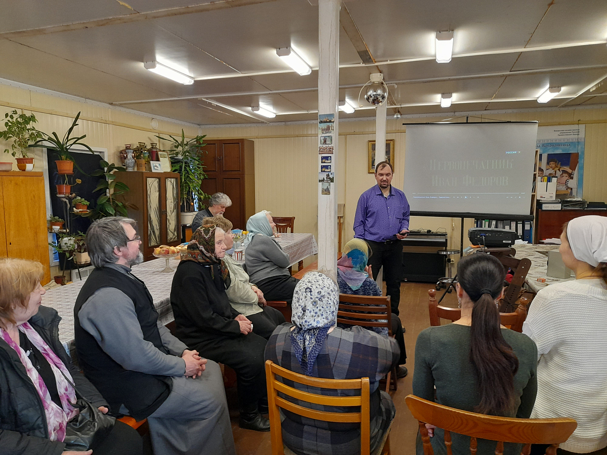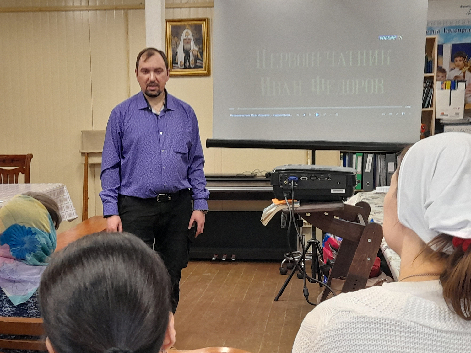 После Воскресной Божественной литургии прихожане собрались в здании трапезной, где их ждал показ художественного фильма «Первопечатник Иван Фёдоров». Показ в рамках православного кинолектория проводил катехизатор храма Михаил Погорелов.