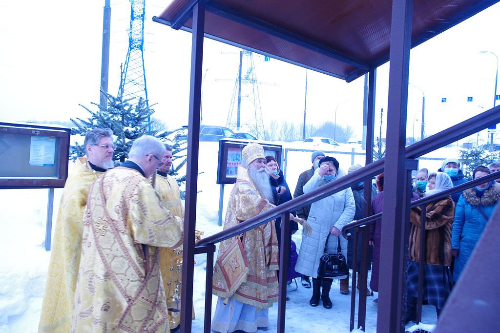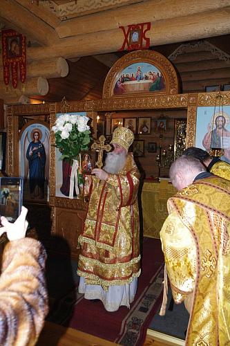 После Богослужения в своем обращении к Преосвященному епископу Феофилакту настоятель храма иерей Виталий Никишин поблагодарил Владыку за архипастырское попечение о временном храме, чин малого освящения которого он совершил 14 марта 2015 года.