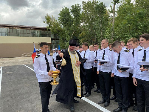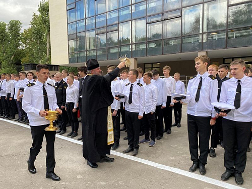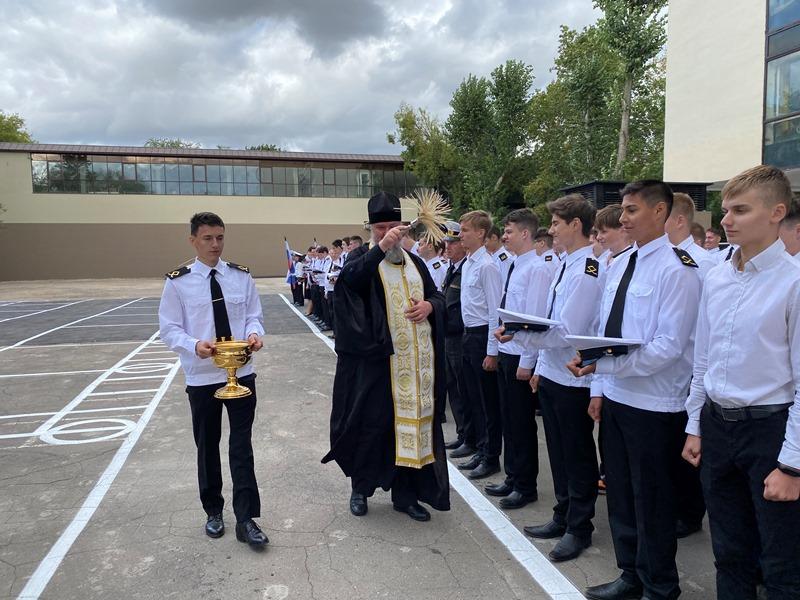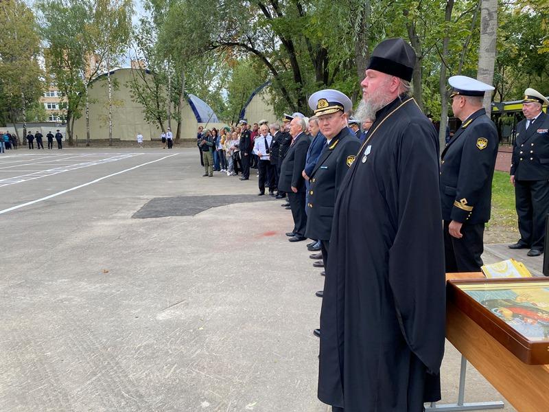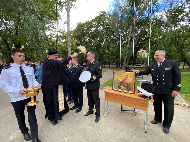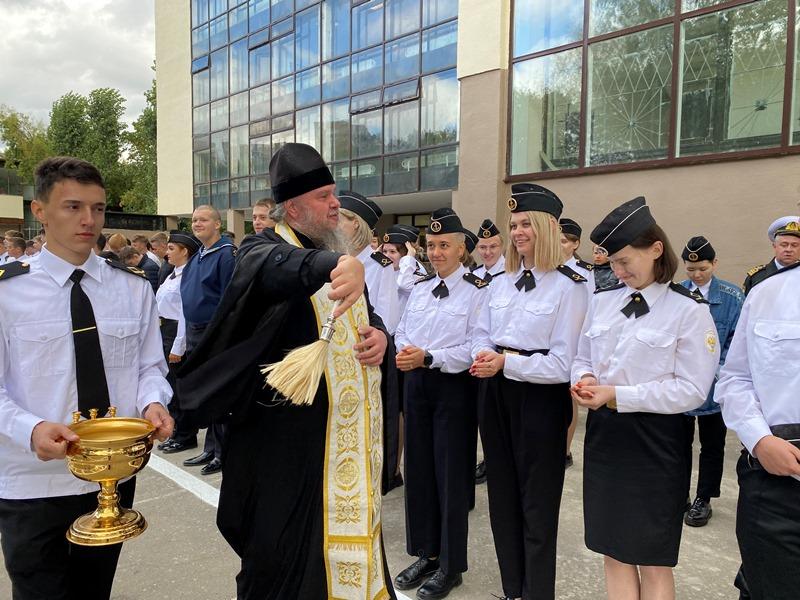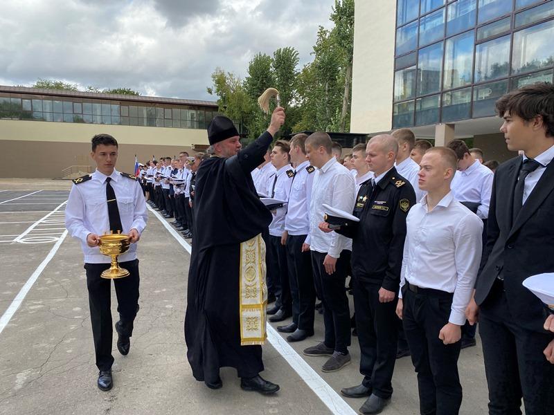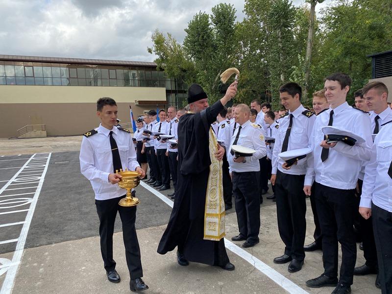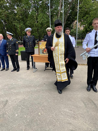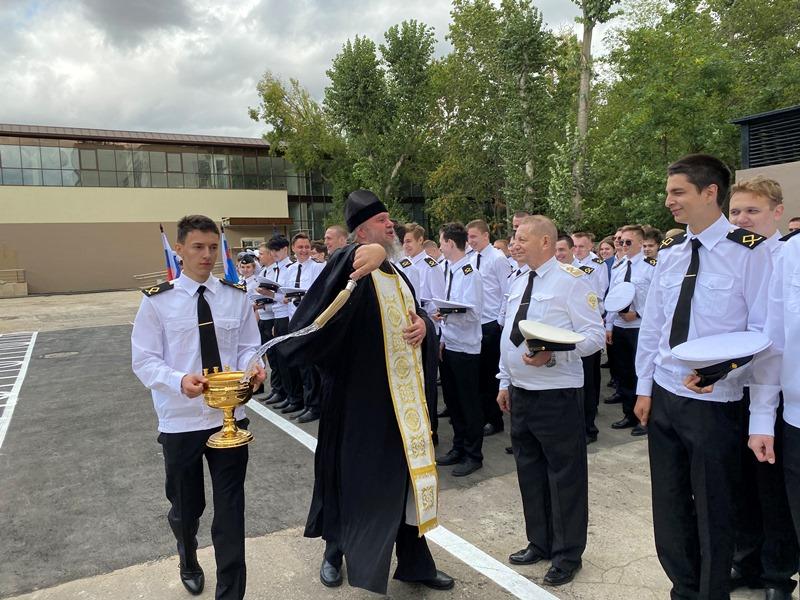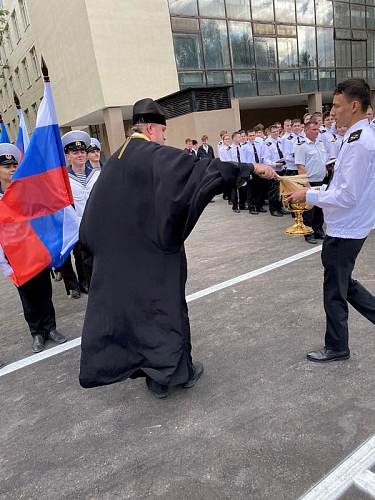 Торжественное построение по случаю Дня знаний окончилось благословением настоятеля храма святого праведного воина Феодора Ушакова игумена Дамиана (Залетова), который обратился к учащимся, преподавателям, родителям и гостям со словом приветствия и по традиции окропил всех Святой водой. В своем слове игумен Дамиан обратил внимание всех присутствующих на пример жизни святого непобедимого адмирала Флота Российского Феодора Ушакова и подарил Академии его икону.
