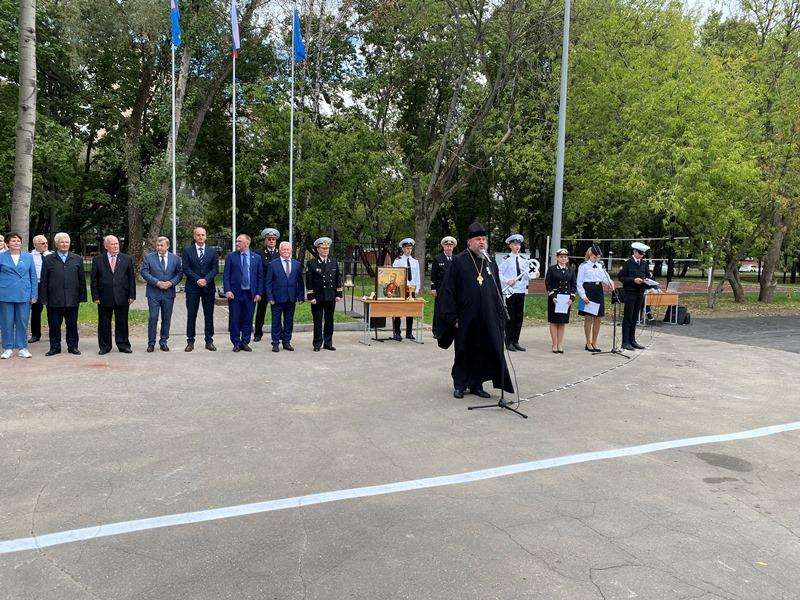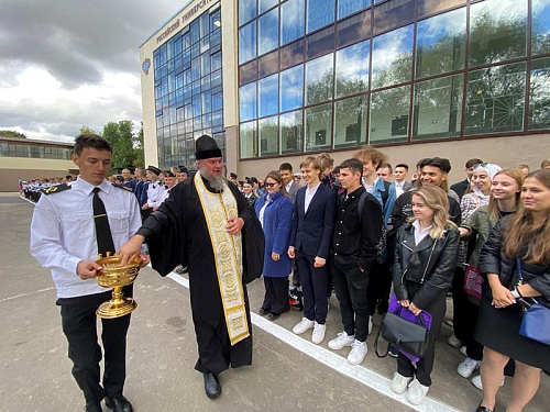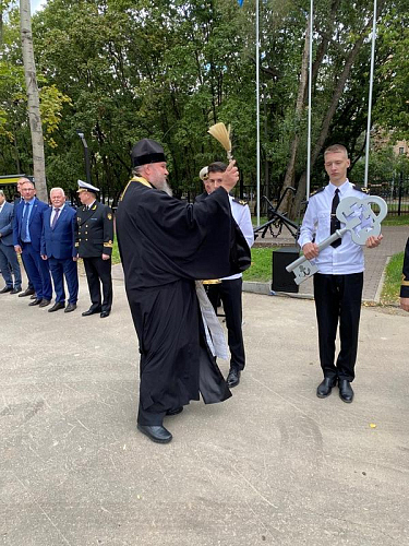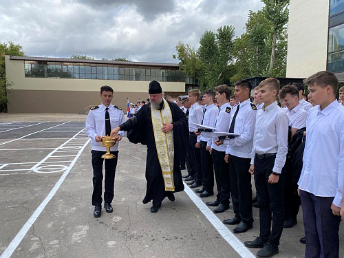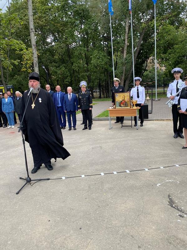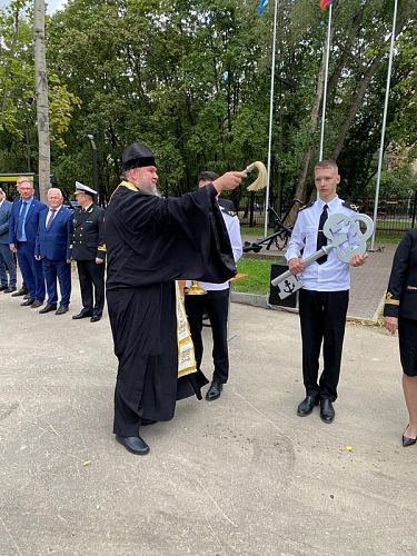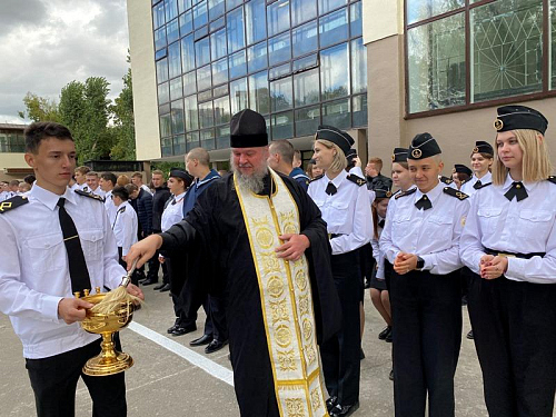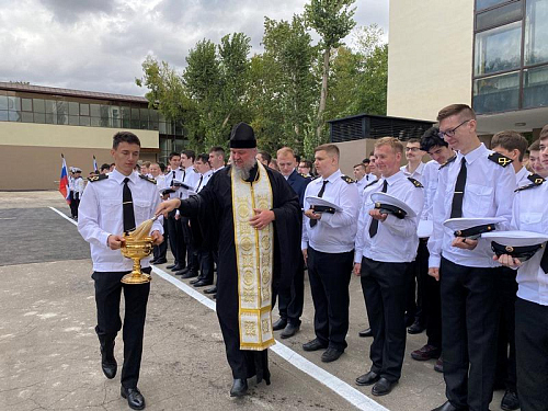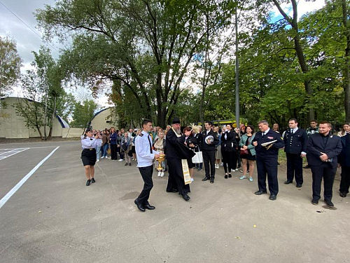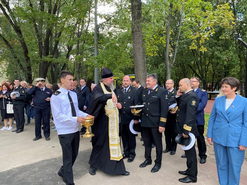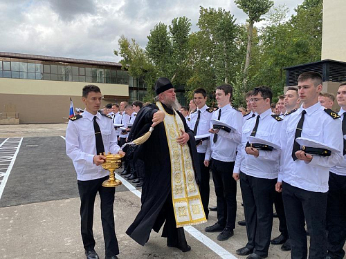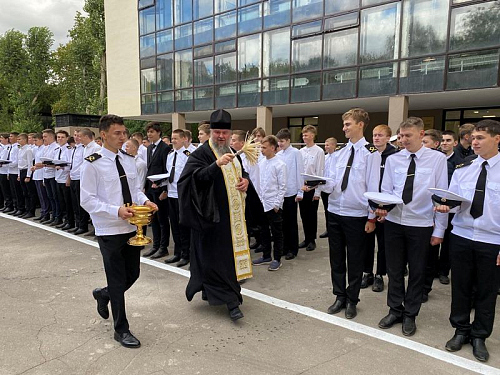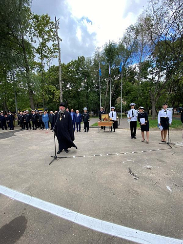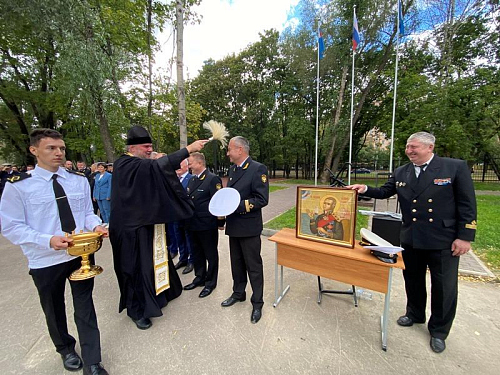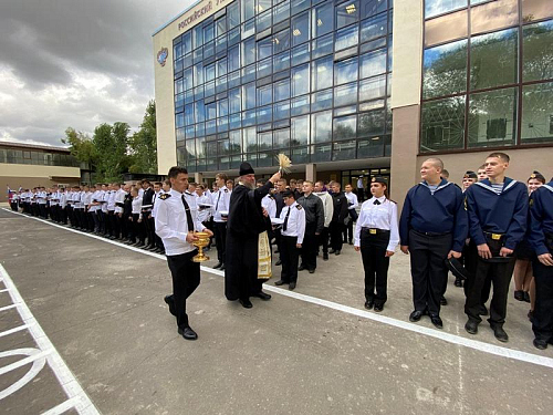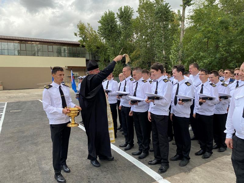 Торжественное построение по случаю Дня знаний окончилось благословением настоятеля храма святого праведного воина Феодора Ушакова игумена Дамиана (Залетова), который обратился к учащимся, преподавателям, родителям и гостям со словом приветствия и по традиции окропил всех Святой водой. В своем слове игумен Дамиан обратил внимание всех присутствующих на пример жизни святого непобедимого адмирала Флота Российского Феодора Ушакова и подарил Академии его икону.