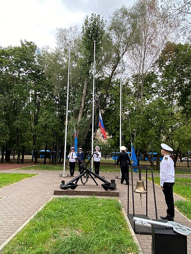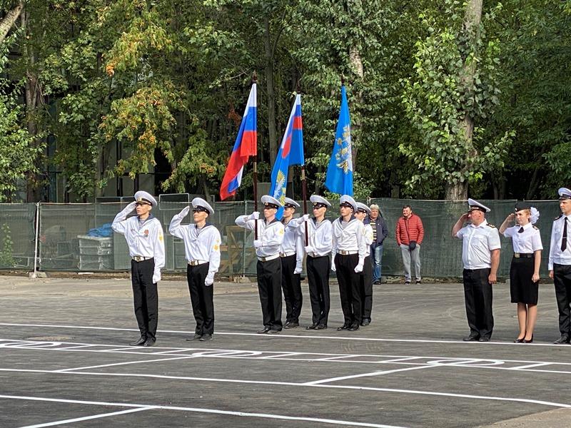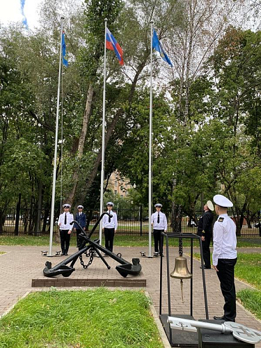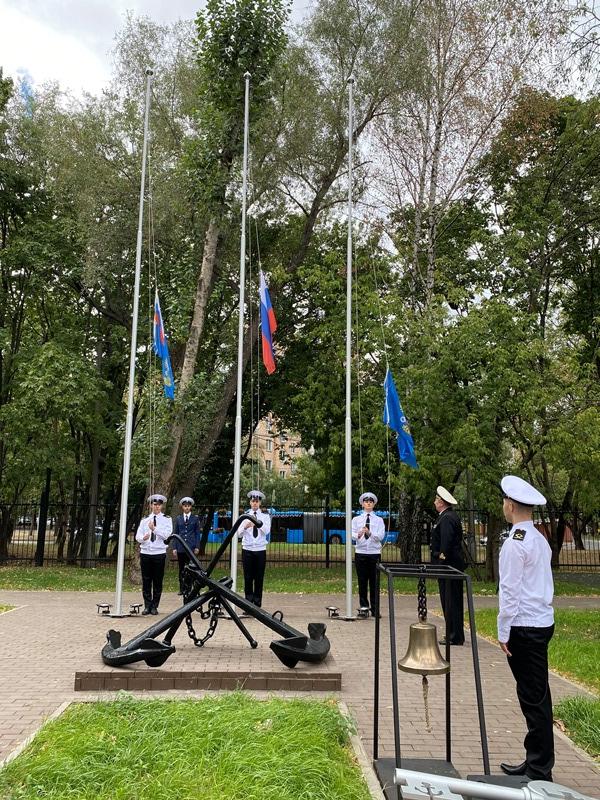 Флаговая группа Академии внесла на плац перед учебным корпусом флаги России, Морского и речного флота и Транспортного университета. Прозвучал гимн России, во время которого были поднят Государственный флаг Российской Федерации.