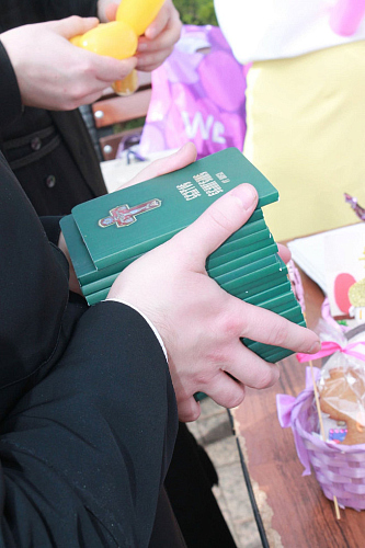 Для самых маленьких была организована раздача собачек из шариков, что вызвало радостные улыбки на лицах детей. Кроме того, участники щедро раздавали экземпляры Евангелия, делясь с окружающими светом Пасхи.
