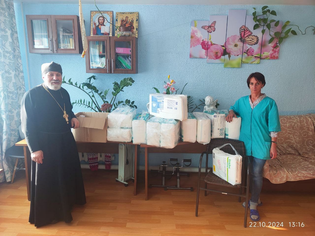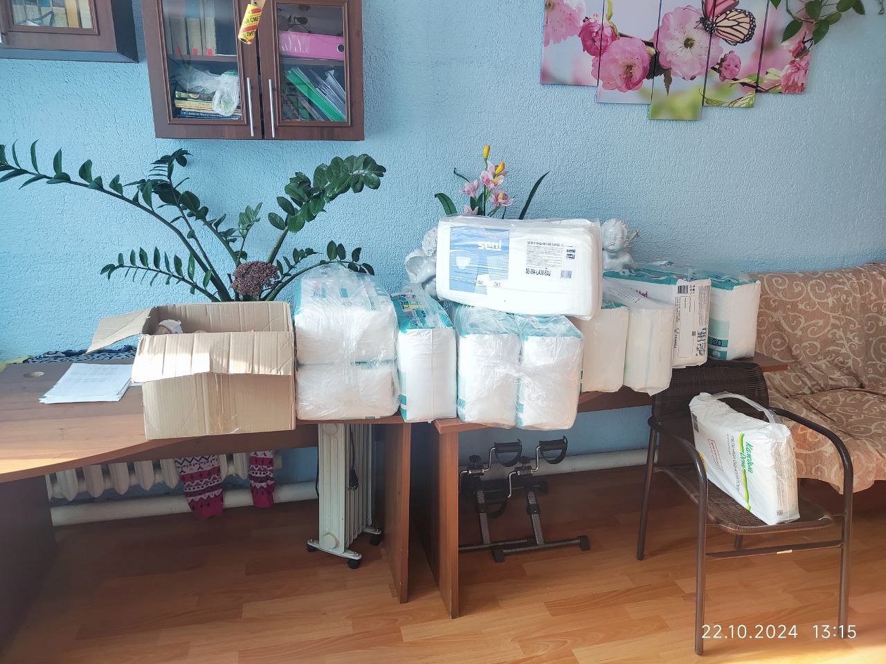 Были переданы продукты питания (мука, макароны, крупы, растительное масло, сахар, сладости), средства гигиены доя лежачих больных, бытовые принадлежности, общим весом 350 кг.