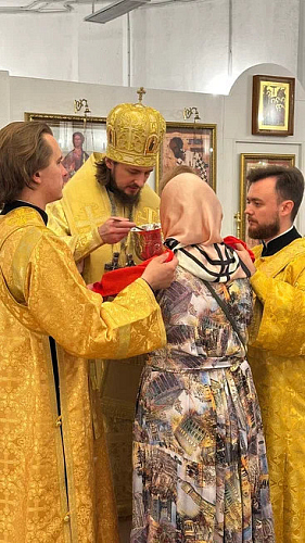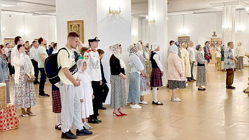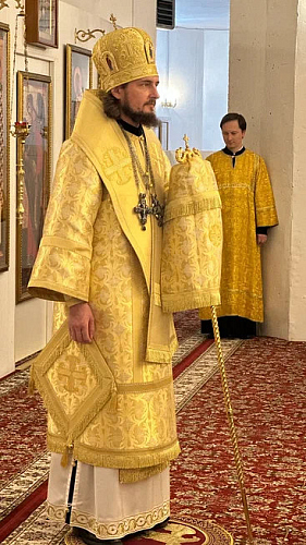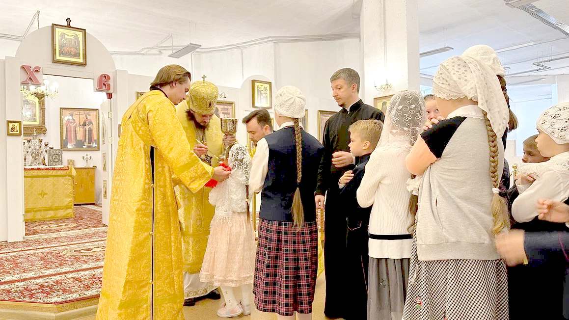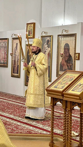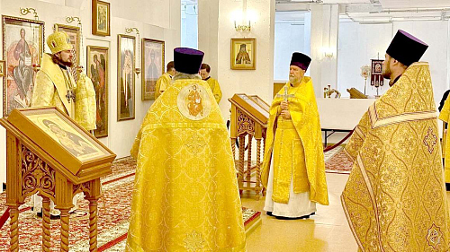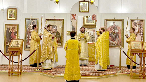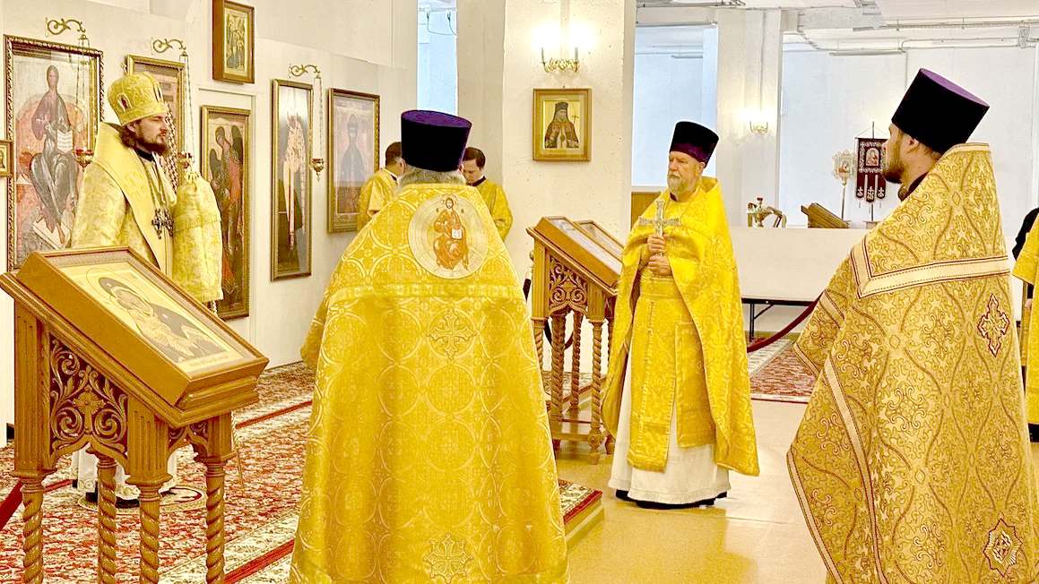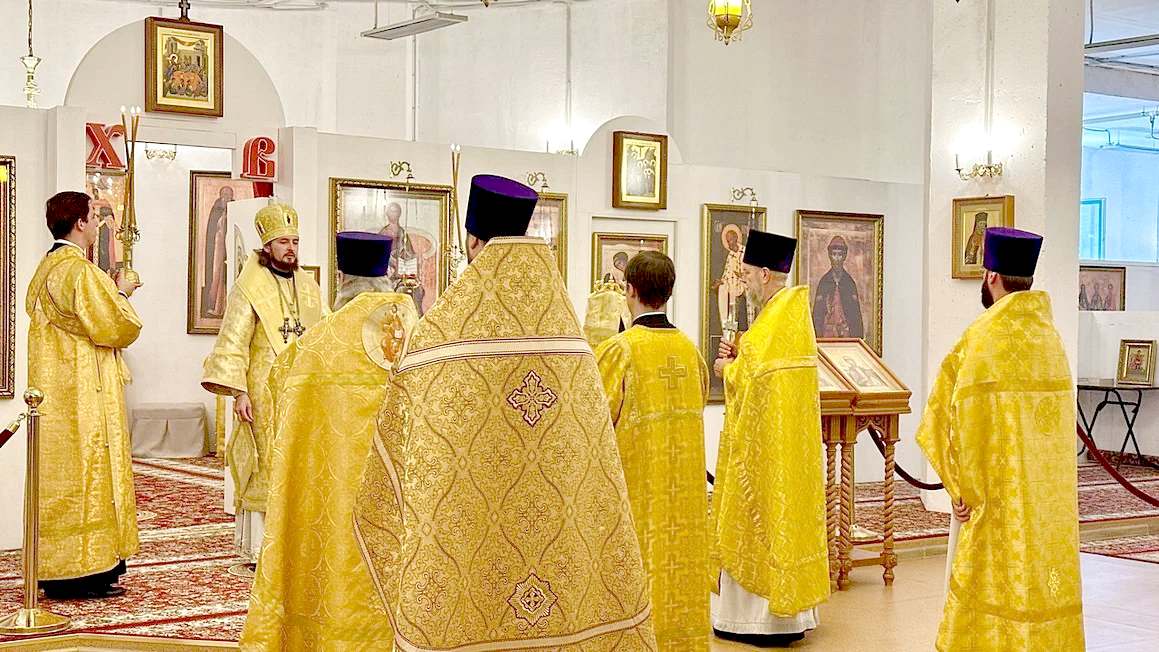 Богослужение состоялось в нижнем храме строящегося собора. За Литургией архиерею сослужили благочинный Параскево-Пятницкого церковного округа протоиерей Анатолий Кожа, настоятель Димитриевского храма протоиерей Андрей Алексеев, клирики храма иерей Анатолий Липатов и диакон Илия Кадин, клирик храма преподобной Евфросинии Московской в Котловке диакон Константин Бабак, а также в качестве приглашённого гостя – клирик храма преподобного Пимена Угрешского Николо-Угрешской духовной семинарии иерей Никита Стратилат. Помолиться на архиерейской службе пришли прихожане и сотрудники Подворья, трудящиеся в различных подразделениях Культурно-образовательного центра «Восход», а также учащиеся Православной гимназии «Восход», в общей сложности более 200 человек.