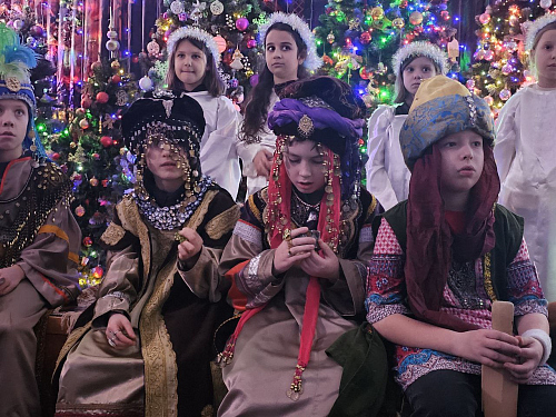 Под таинственную чудесную музыку все участники движутся вслед за Вифлеемской звездой к старинному вертепу, установленному за дверью и освещенному огоньками гирлянд, поклоняются рожденному Младенцу Христу, а волхвы с торжественными словами дарят Спасителю золото, ладан и смирну, оставляя их у вертепа.