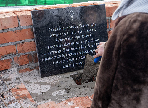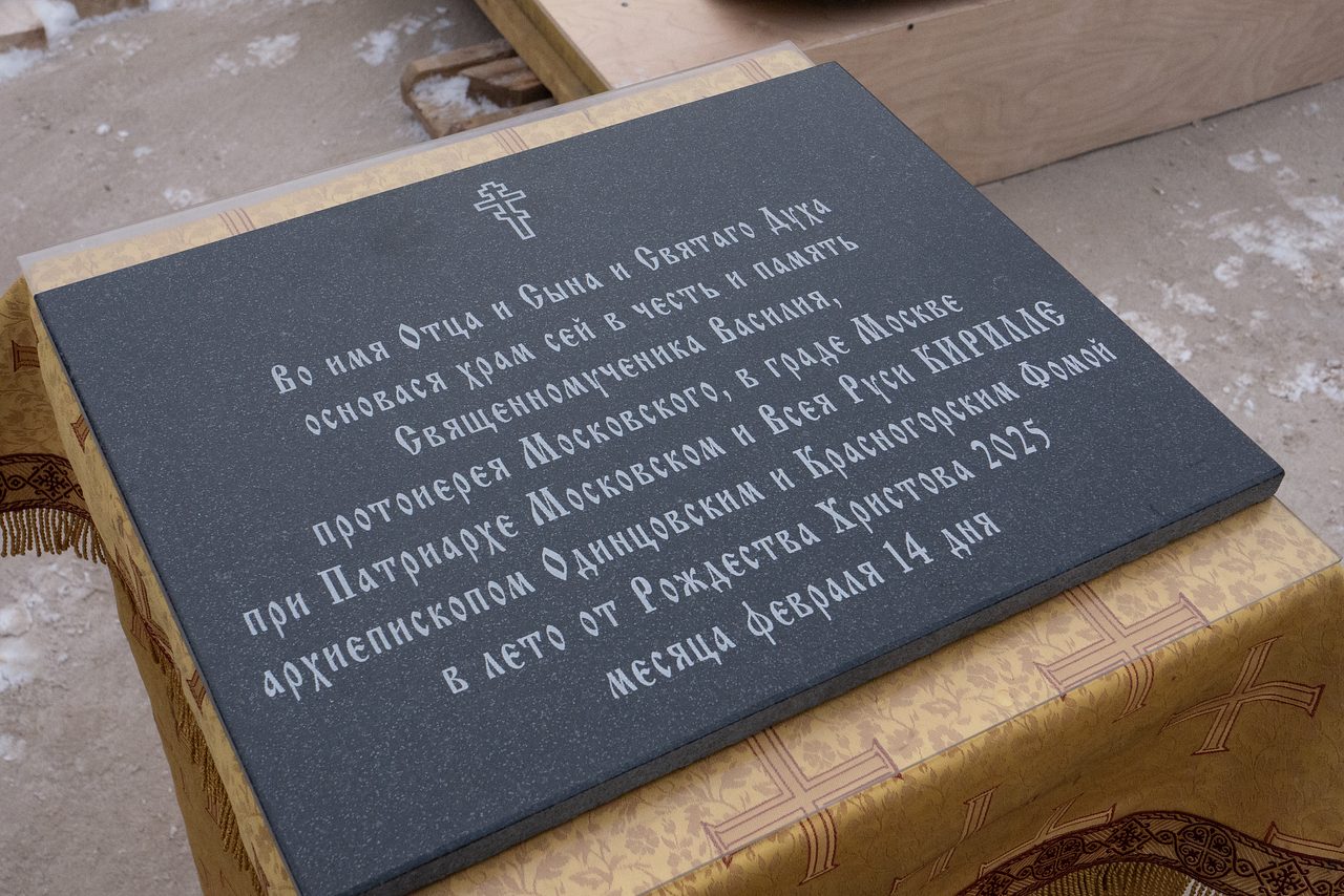 "Во имя Отца и Сына и Святаго Духа основася храм сей в честь и память Священномученика Василия, протоиерея Московского, в граде Москве при Патриархе Московском и Всея Руси КИРИЛЛЕ, архиепископом Одинцовским и Красногорским Фомой в лето от Рождества Христова 2025 месяца февраля 14 дня".