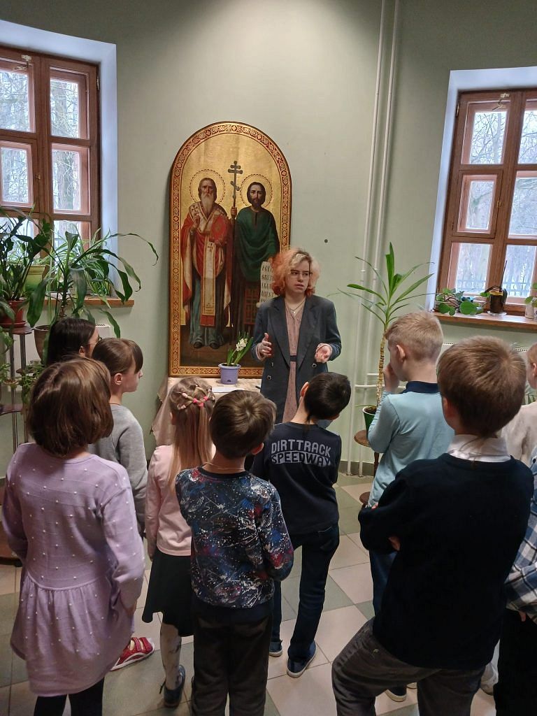 В холле школы у иконы святых равноапостольных Кирилла и Мефодия преподаватель церковнославянского языка Ширягина Анна Васильевна рассказала детям о вкладе святых просветителей славянских народов в развитие письменности на Руси,