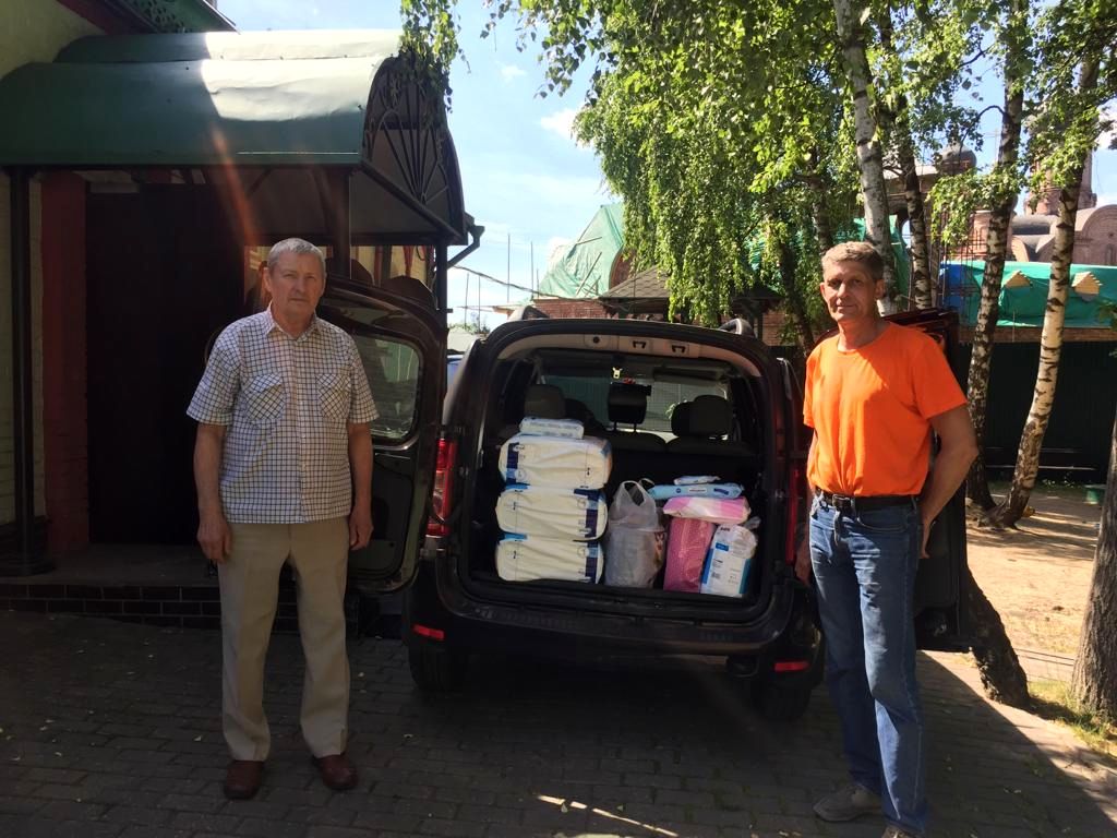 Были доставлены: святая вода с молебна Животворящему Кресту Господню, средства гигиены по уходу за лежачими больными, памперсы, а также продукты, пожертвованные прихожанами храма.