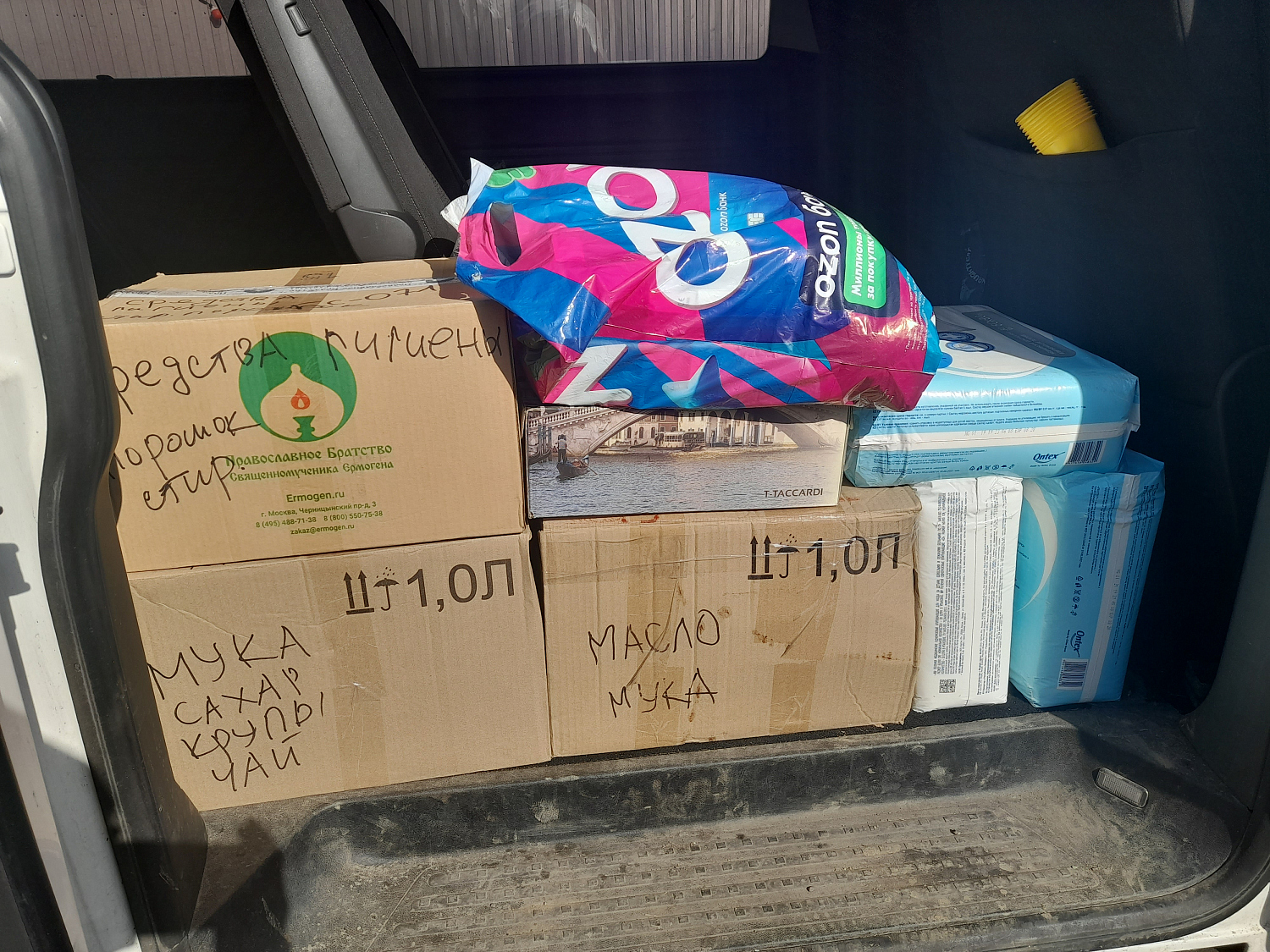Пожертвованные прихожанами продукты, средства гигиены, постельные принадлежности, одежда и обувь были рассортированы и упакованы добровольцами храма и отвезены в Церковный штаб помощи беженцам, расположенный по адресу: улица Николоямская, д. 49, стр.3.