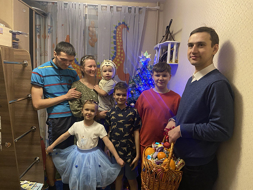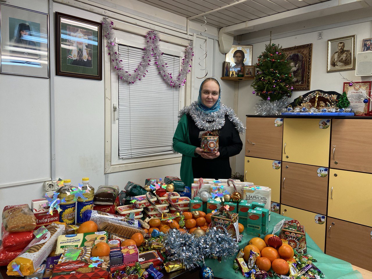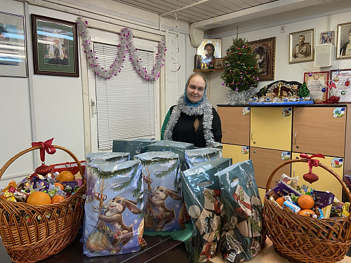 Добровольцы пропели праздничный тропарь и колядки, вручили Рождественские подарочные наборы из продуктов, сладостей и фруктов, а также украшения на елку, сделанные руками детей из Воскресной школы.