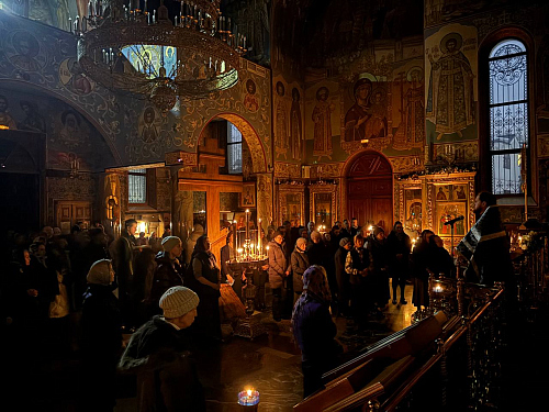 Была совершена вечерня с чтением акафиста Божественным Страстям Христовым, после чего прозвучало Евангелие от Матфея (главы 26 и 27).