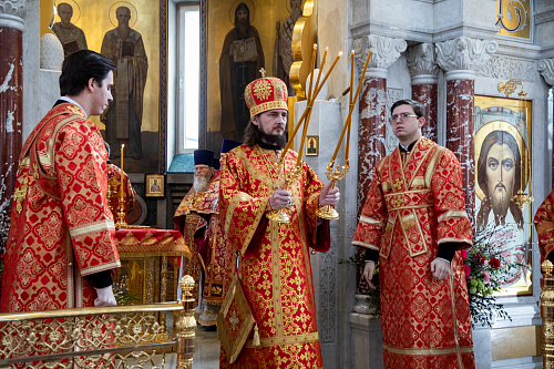 Епископ Раменский Алексий, викарий Святейшего Патриарха Московского и всея Руси, управляющий Юго-Западным викариатством г. Москвы, возглавил Литургию святителя Иоанна Златоуста в храме святого праведного воина Феодора Ушакова в Южном Бутове.