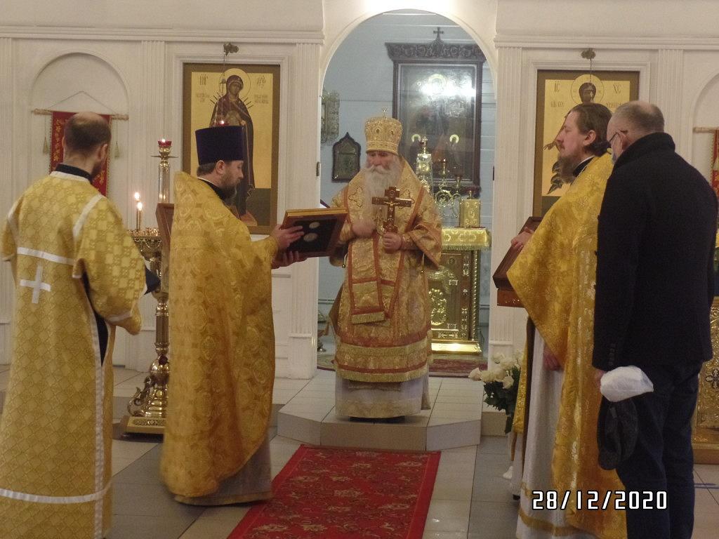 После Богослужения настоятель храма иерей Максим Глухих обратился к Его Преосвященству, выразив благодарность за радость совместного Богослужения и общей молитвы. Епископу Феофилакту в дар от настоятеля и прихожан храма была преподнесена икона Пресвятой Троицы.