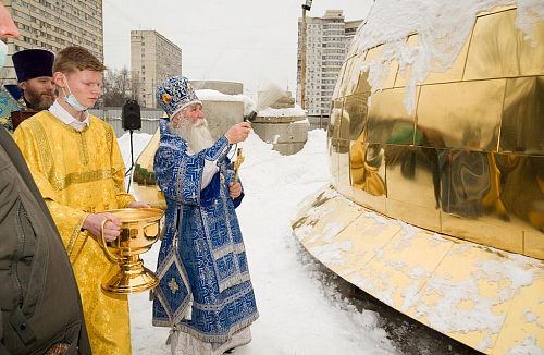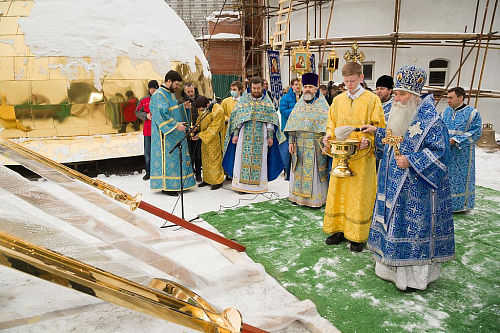 По окончании Божественной Литургии, был совершен крестный ход к месту строительства каменного храма в честь иконы Божией Матери «Отрада и Утешение». Преосвященный Владыка освятил кресты, купола и колокола для строящегося храма.