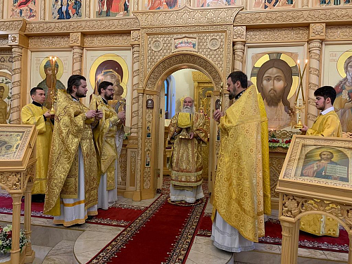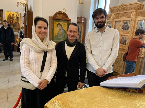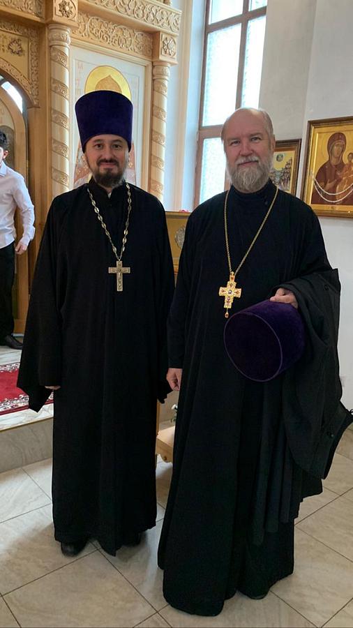 После Богослужения настоятель храма выразил благодарность Его Преосвященству за радость совместного Богослужения и общей молитвы и преподнес в дар для Андреевского ставропигиального монастыря Богослужебные покровцы и воздух.