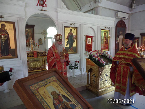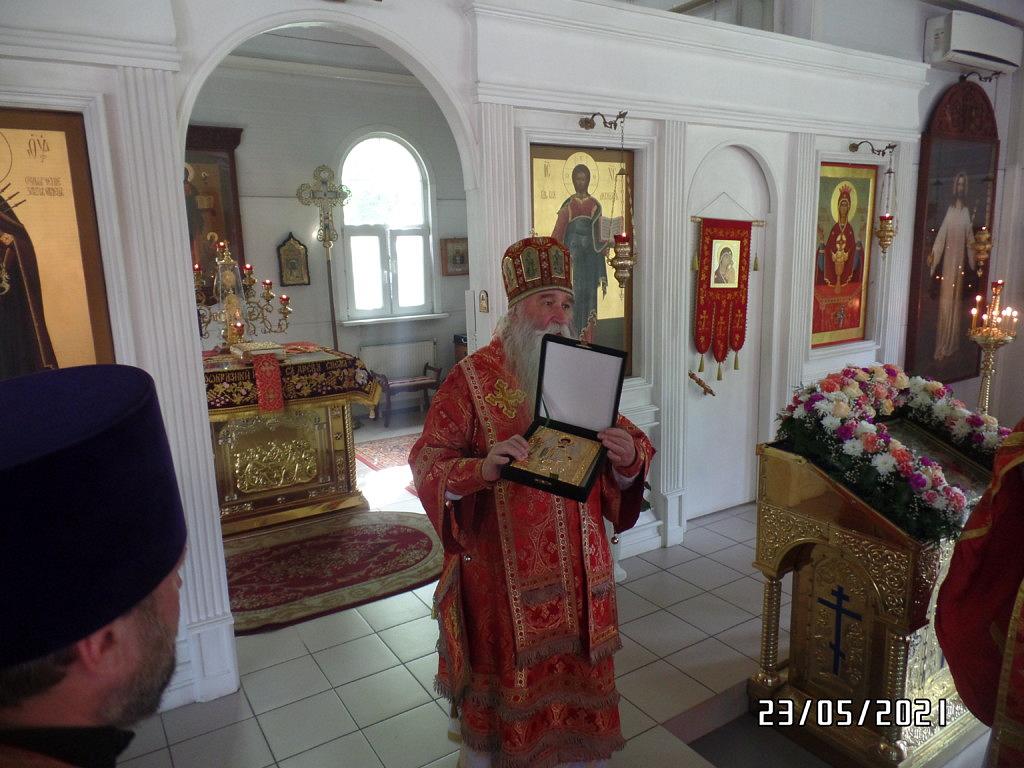 После Богослужения настоятель храма иерей Максим Глухих обратился к Его Преосвященству с приветственным словом, выразив благодарность за радость совместного Богослужения и общей молитвы. Епископу Феофилакту в дар была преподнесена икона святого благоверного князя Александра Невского.