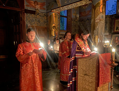 Его Преосвященству сослужил клирик храма диакон Константин Бабак. Перед началом Литургии читался акафист Воскресению Христову.