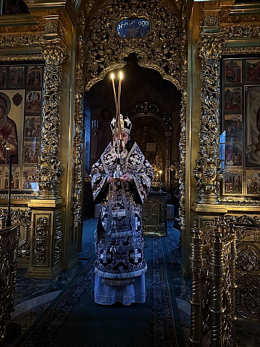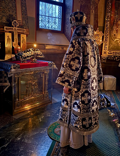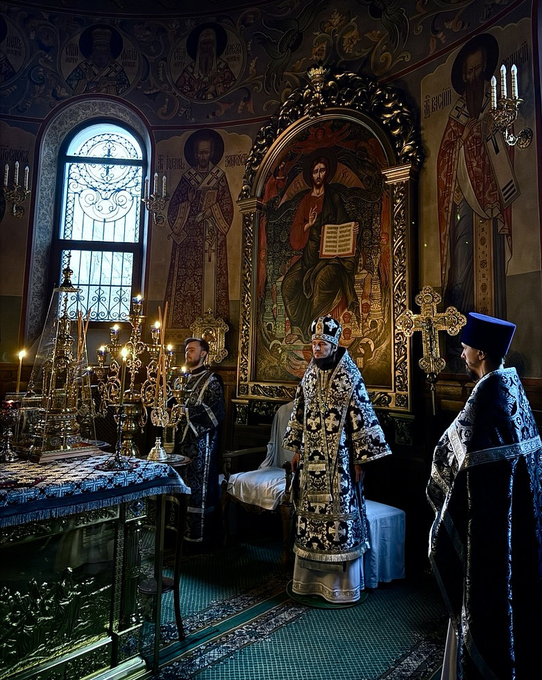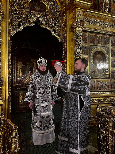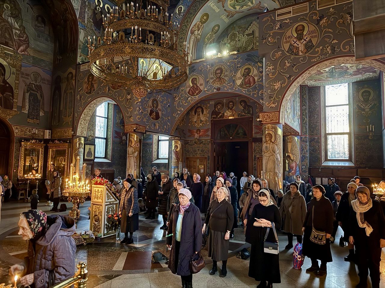 Богослужебные песнопения исполнил мужской хор храма преподобной Евфросинии Московской. На сугубой ектении были вознесены особые прошения, Преосвященнейший Владыка прочитал молитву о Святой Руси.