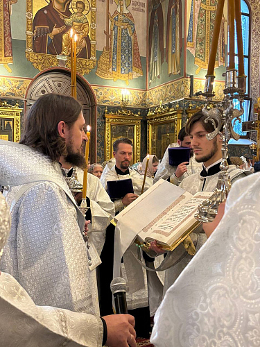 Богослужебные песнопения на церковнославянском и греческом языках исполнил мужской хор храма преподобной Евфросинии Московской (регент Даниил Кузин). Символ веры и молитву «Отче наш» соборно исполнили все присутствующие.
