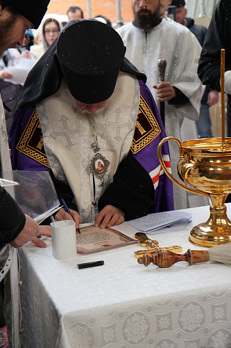 По окончании Богослужения епископ Пантелеимон поздравил верующих с освящением места закладки храма.