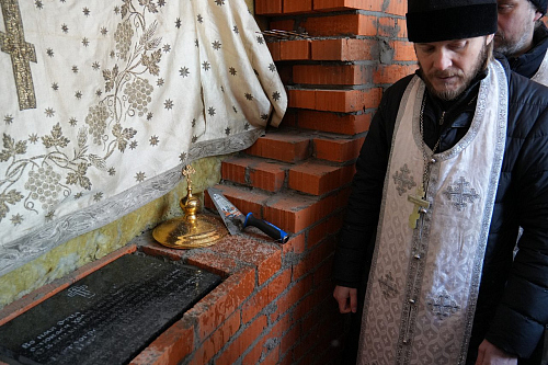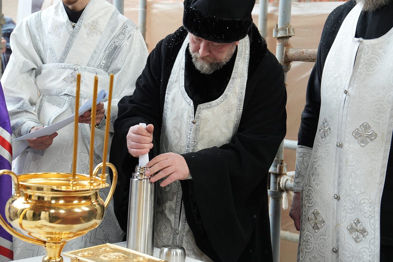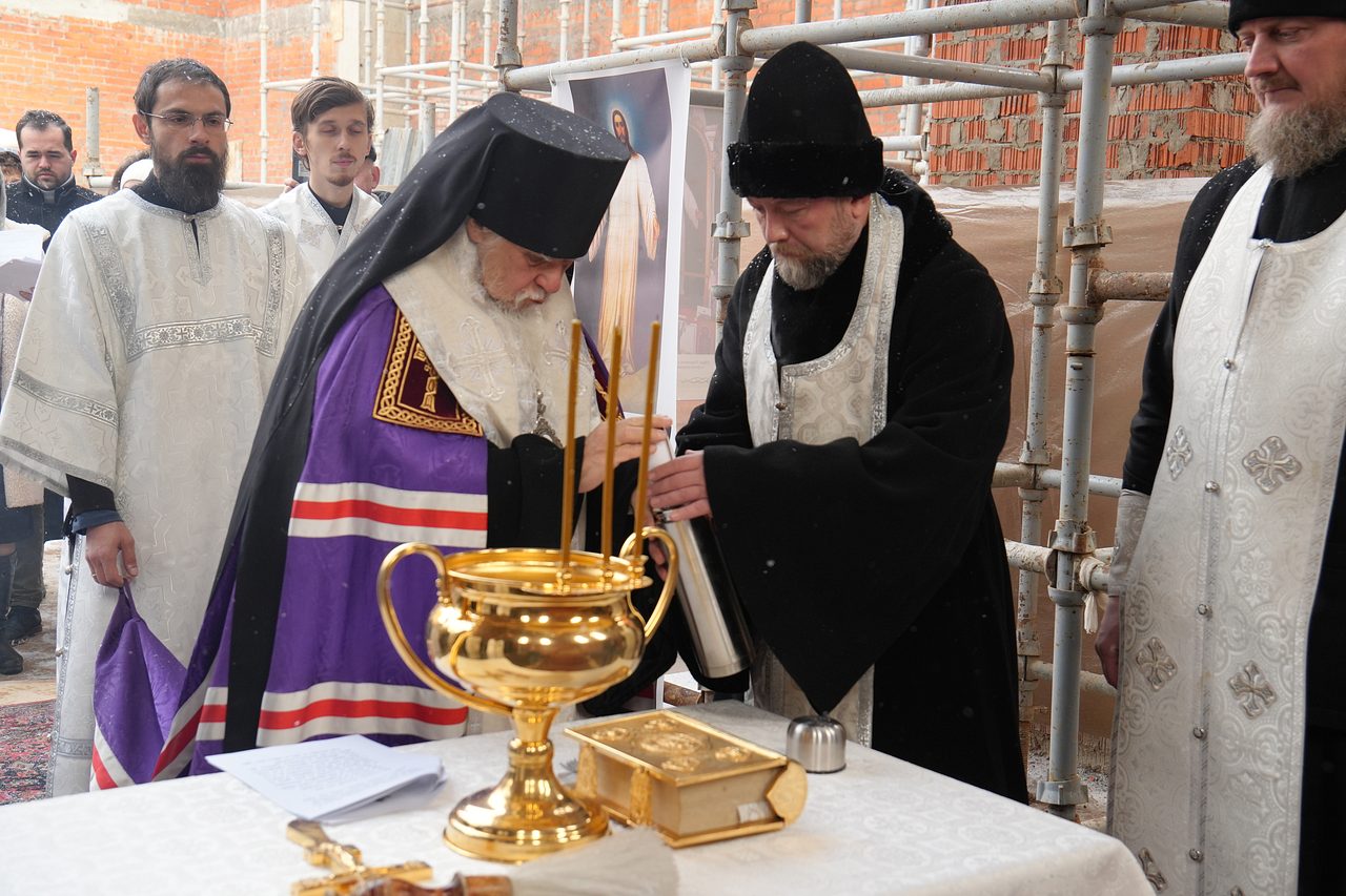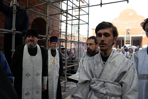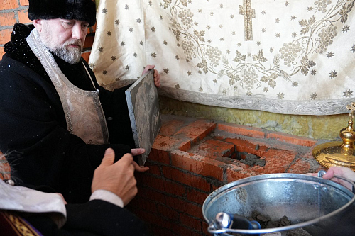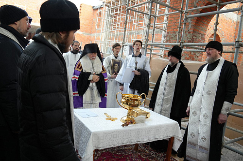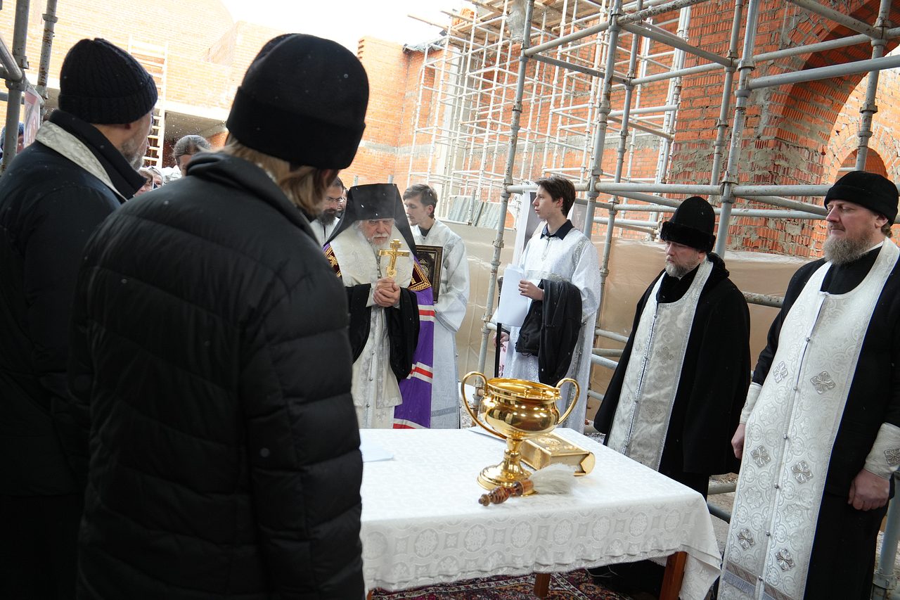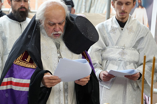 По завершении Божественной Литургии Владыка совершил чин освящения места закладки храма священномученика Серафима, митрополита Петроградского.