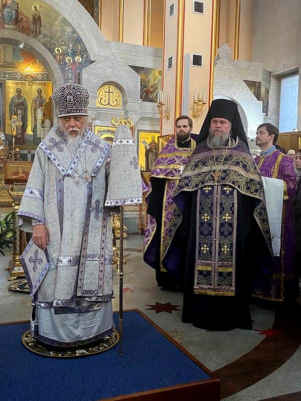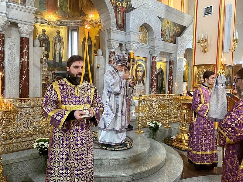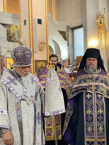 Преосвященному архипастырю сослужили: настоятель храма игумен Дамиан (Залетов), клирики храма иерей Василий Белов и иерей Кирилл Тарасенко.