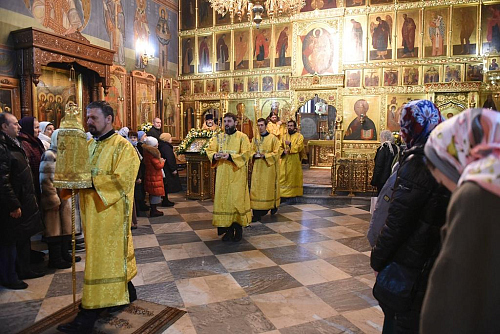 На сугубой ектении были также возглашены прошения о заключенных, поскольку в день памяти святителя Николая Чудотворца в Москве, по благословению Святейшего Патриарха Московского и всея Руси Кирилла, проводится благотворительная акция «День милосердия и сострадания ко всем во узах темничных находящимся».