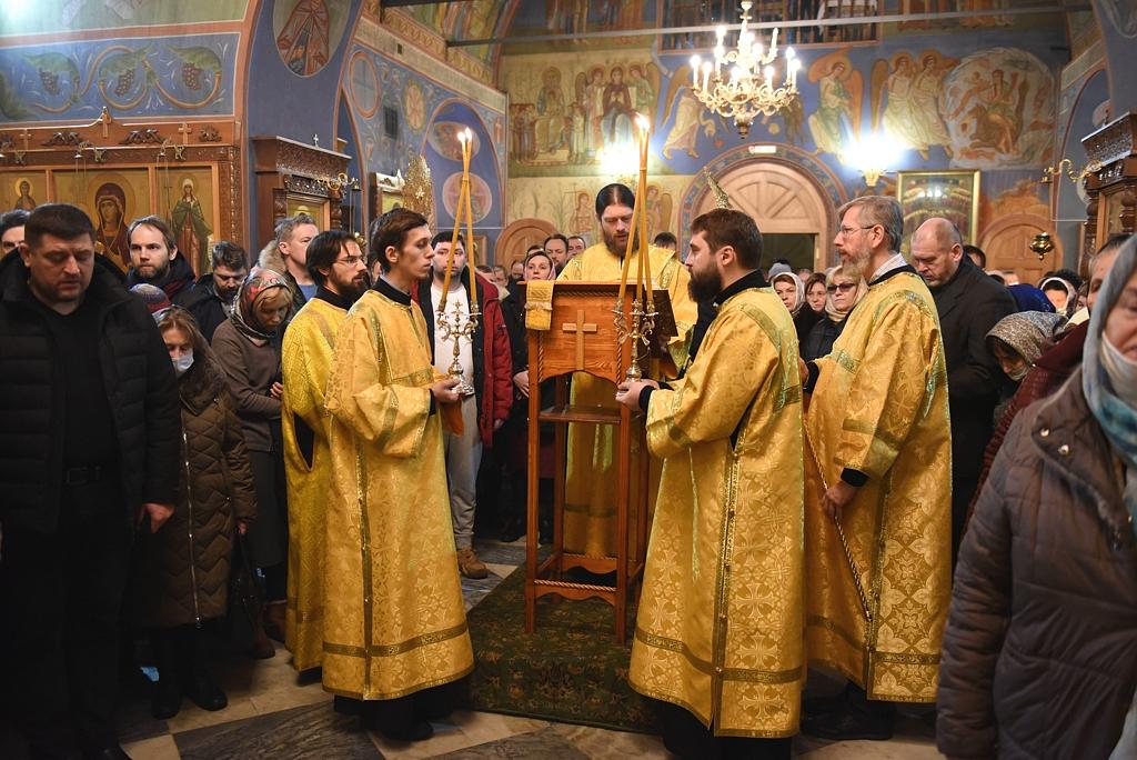 После сугубой ектении Владыка вознес молитву о заключенных: «Господи, Иисусе Христе, Боже наш, Крестом во ад сошедый, диавола посрамивый, заклепы и вратницы адовы разрушивый, узники свободивый и жизнь миру Твоему даровавый, призри на молитву смиренных и недостойных раб Твоих, ко Твоему Величеству бесприкладному и бездне человеколюбия прибегающих и яко Благосерд Твоею милостию и щедротами посети грехми обремененныя и в заключении темничном сущия: Ты бо рекл еси, Господи, яко хотением не хощу смерти грешника, но еже обратитися и живу быте ему. Услыши в скорби и тесноте душевной призывающих Тя: в немощи находящихся душевныя и телесныя их раны уврачуй; в ожесточении сердечном сущия к покаянию обрати; правды и оправданий Твоих ищущих в вере и творении заповедей утверди и на путь спасения настави. Ты бо еси, Господи, помощь беспомощным, надеждо ненадежным, спасение отчаянным, всем вся буди и приведи ко пристанищу хотения Твоего. Да поем и славим Тя со Безначальным Твоим Отцем, и Пресвятым и Благим и Животворящим Твоим Духом ныне, и присно и во веки веков. Аминь».