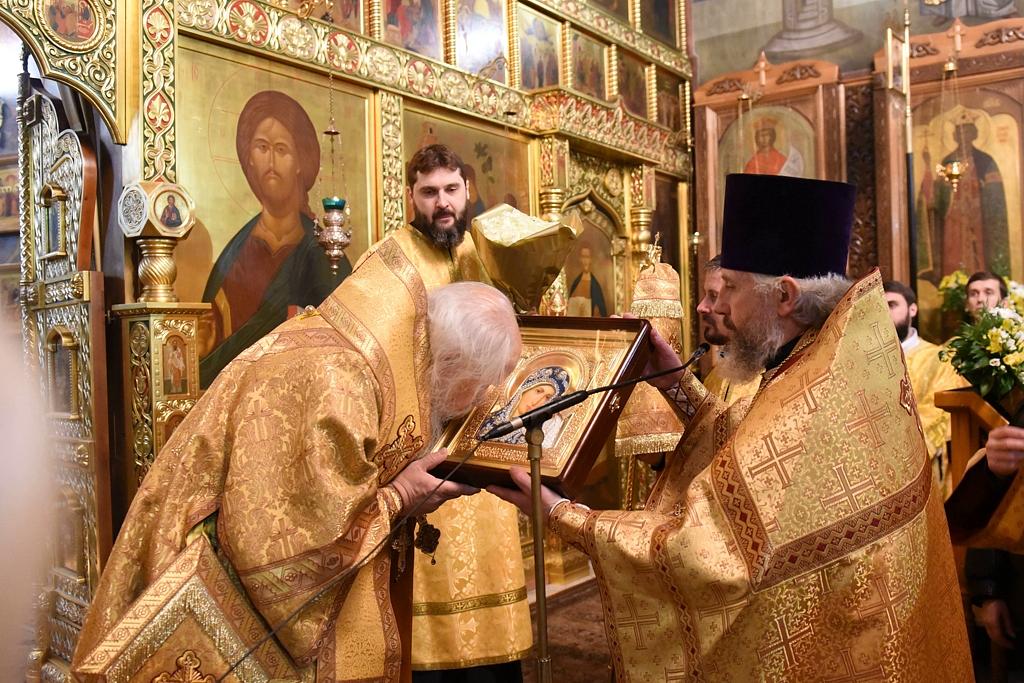 По окончании Божественной Литургии протоиерей Николай Карасев обратился к епископу Пантелеимону с приветственным словом, поблагодарил Владыку за совершенное совместное Богослужение и преподнес в дар образ Казанской Божией Матери.