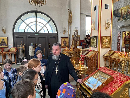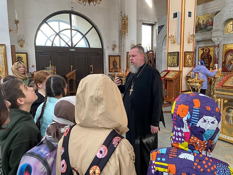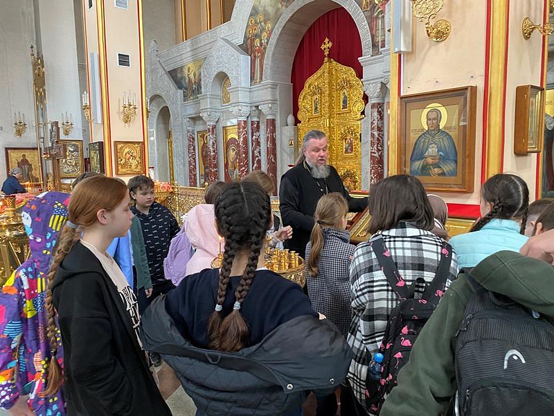 Внутри храма игумен Дамиан рассказал школьникам о тех событиях жизни Небесного покровителя храма - святого адмирала Феодора Ушакова и других Святых, которые стали примерами добродетели, преданности, смелости и скромности.