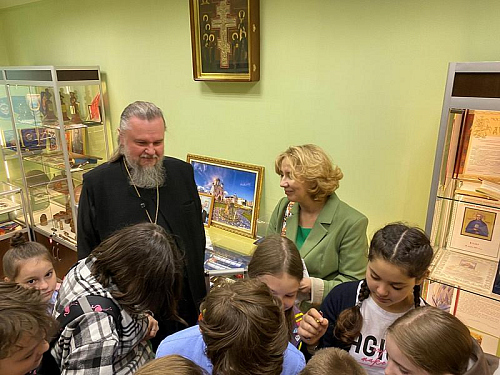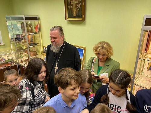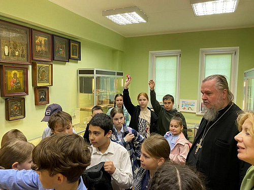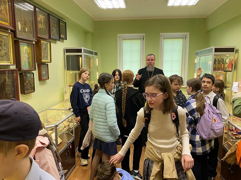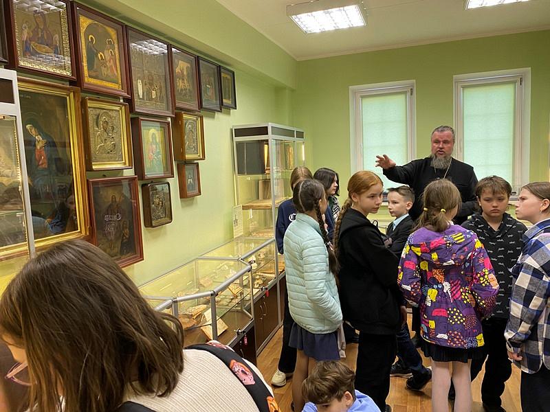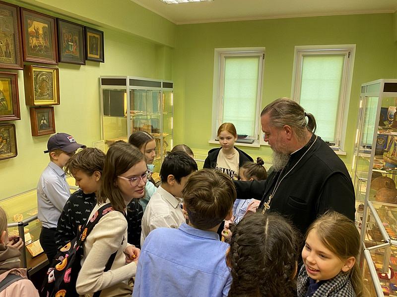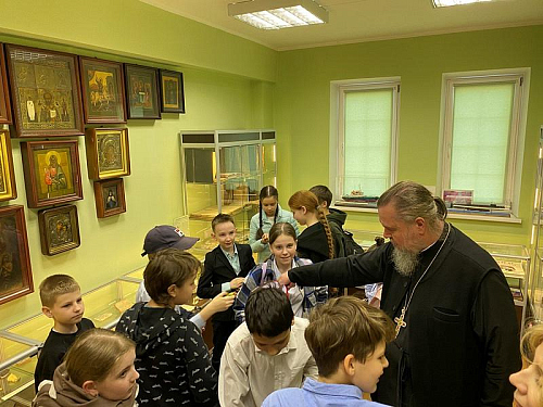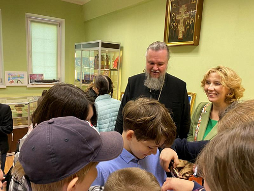 Школьники посетили церковно-археологический музей храма. Игумен Дамиан показал им особый экспонат. Этот уникальный экспонат передали в новый музей представители Московского отделения Российского военно-исторического общества и поисковиков Военно-патриотического объединения «Нарский рубеж».
