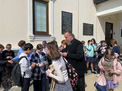 Игумен Дамиан подарил каждому школьнику календарик с изображением храма. Также ребят угостили конфетами.