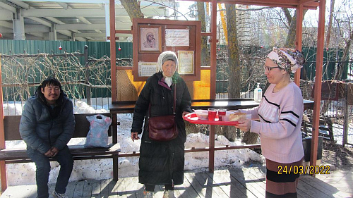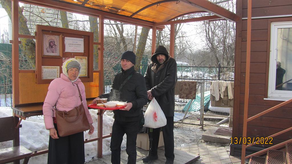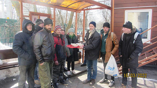 Волонтеры, представители приходского молодежного объединения храма готовят и ежедневно раздают горячие обеды для бездомных. Продукты жертвуют прихожане. В день удается накормить 10-15 человек.