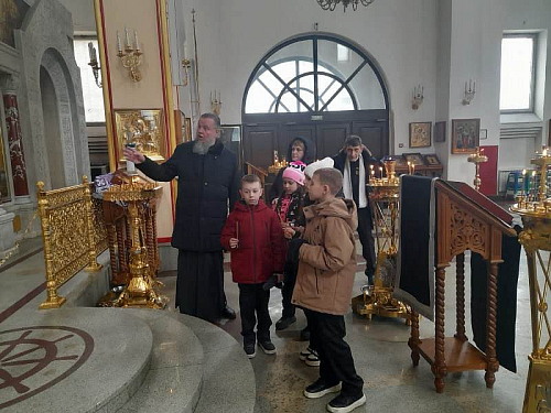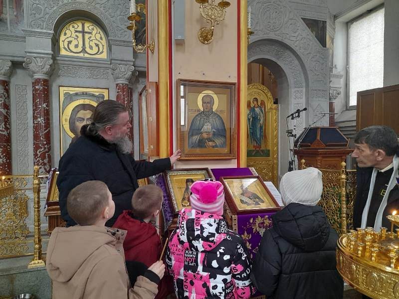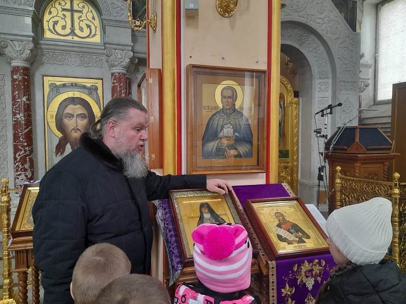 Внутри храма игумен Дамиан рассказал школьникам о тех событиях жизни Небесного покровителя храма - святого адмирала Феодора Ушакова и других Святых, которые стали примерами добродетели, преданности, смелости и скромности.